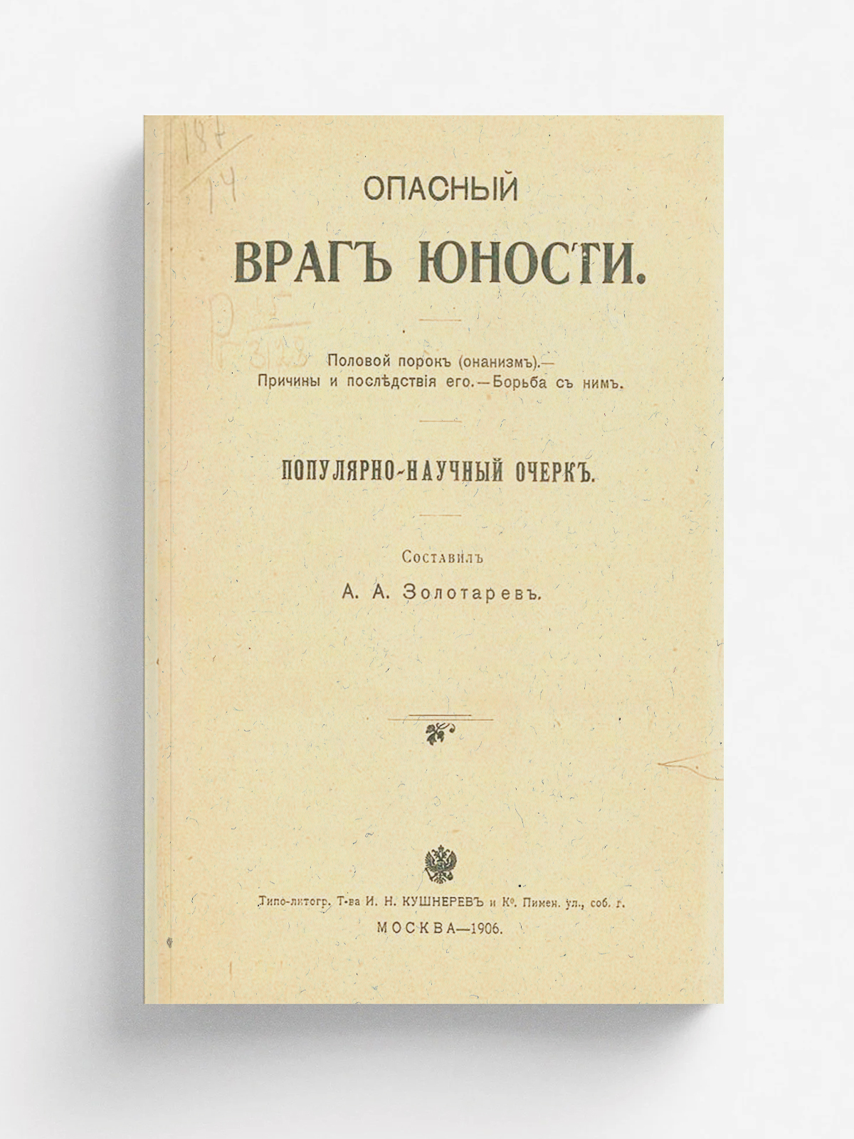 Золотарев, Леонид Алексеевич. Опасный враг юности : Половой порок (онанизм). Причины и последствия его. Борьба с ним : Попул. очерк / Сост. А. [!] А. Золотарев. — Москва : типо-лит. т-ва И.Н. Кушнерев и К°, 1906. — 110 с.; 18.