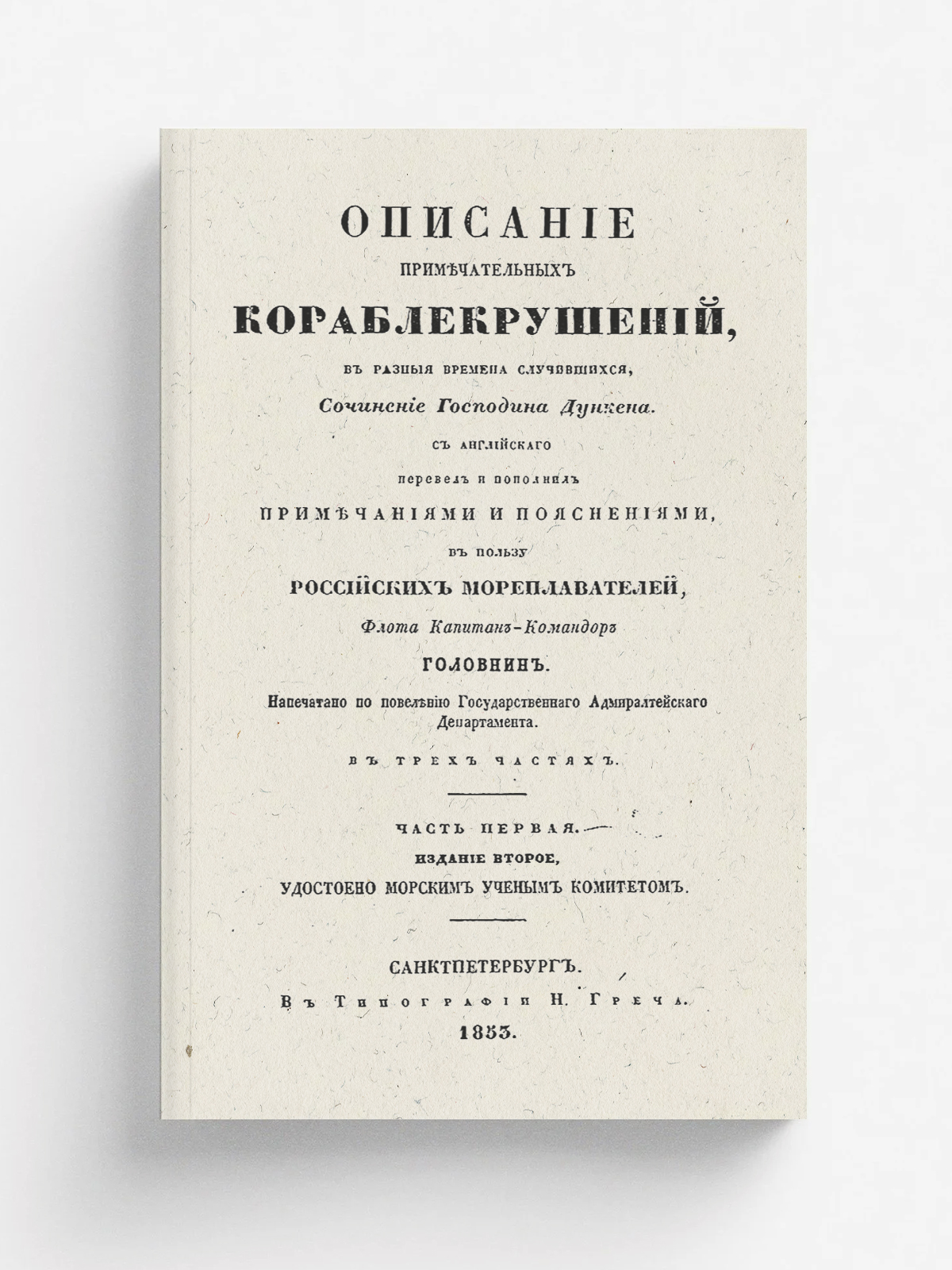 Дункен, А., Головнин, В. М. Описание примечательных кораблекрушений в разные времена случившихся. : Часть 1-2 : в трёх частях / с английского перевёл и пополнил примечаниями и пояснениями Флота Капитан-Командор Головнин. — издание второе. — типография Н. Греча, 1853. — 159 с.