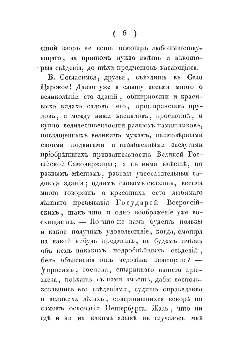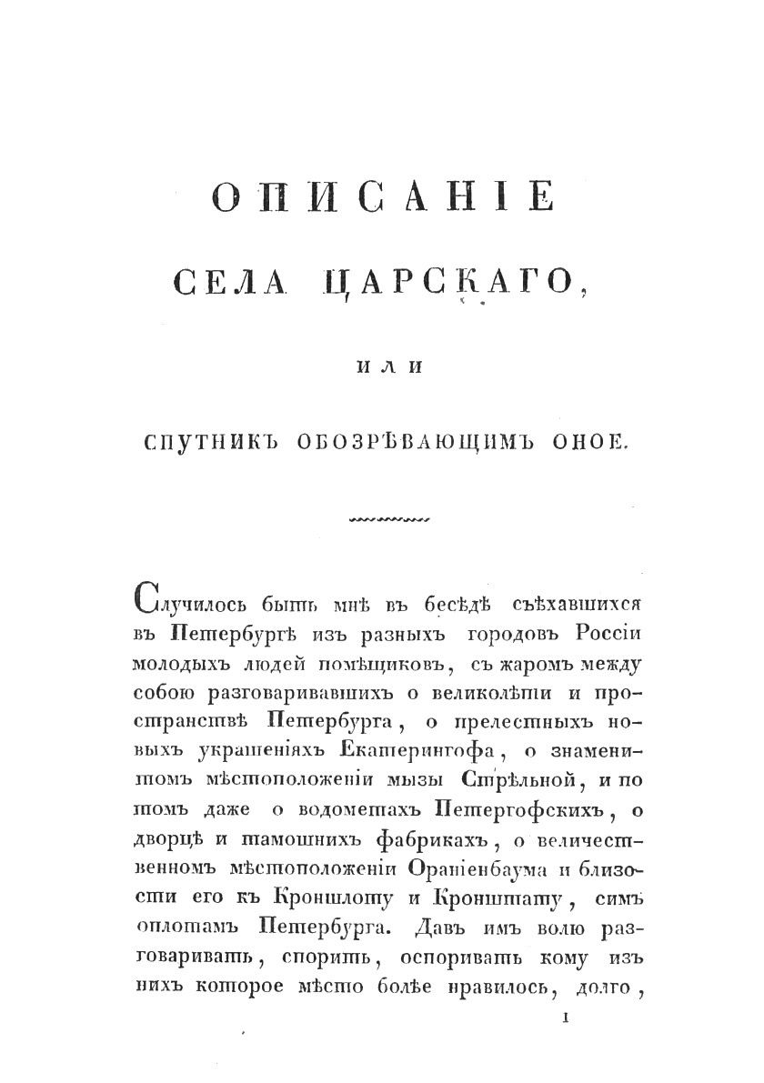 К изданию сей книги, с планом Села Царского, я имел важную причину, что доныне, приезжающие туда в первый раз, не имели чем руководствоваться при его осматривании. По сему, в виде спутника, рассказываю о каждом обозреваемом предмете с некоторыми историческими объяснениями.
