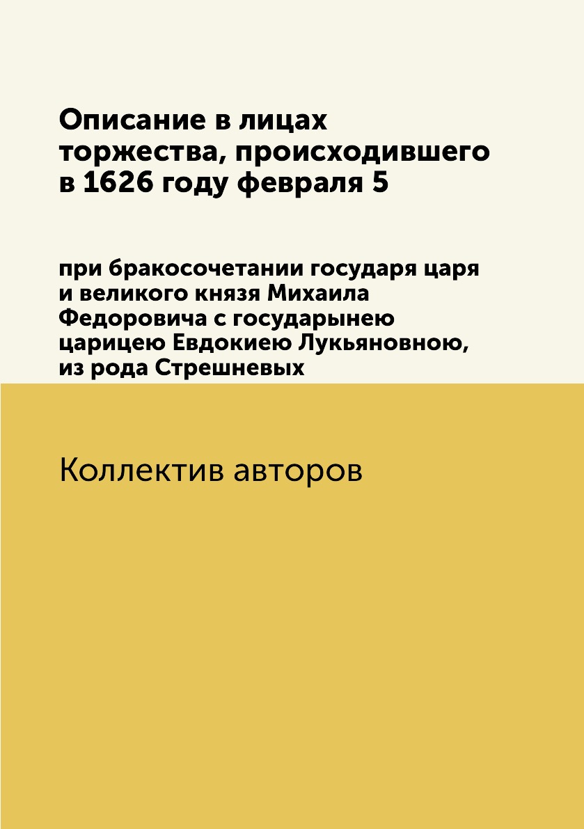 Печатная книга «Описание в лицах торжества, происходившего в 1626 году февраля 5, при бракосочетании государя царя и великого князя Михаила Федоровича с государынею царицею Евдокиею Лукьяновною, из рода Стрешневых» в мягкой обложке, язык - русский. В книге 137 страниц, она напечатана на белой офсетной бумаге плотностью 80 г/м². Формат издания — 148x210 мм. Все книги аккуратно упаковываем в прочный трёхслойный непрозрачный картонный конверт.