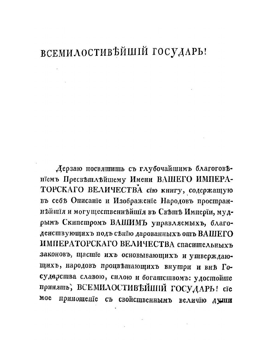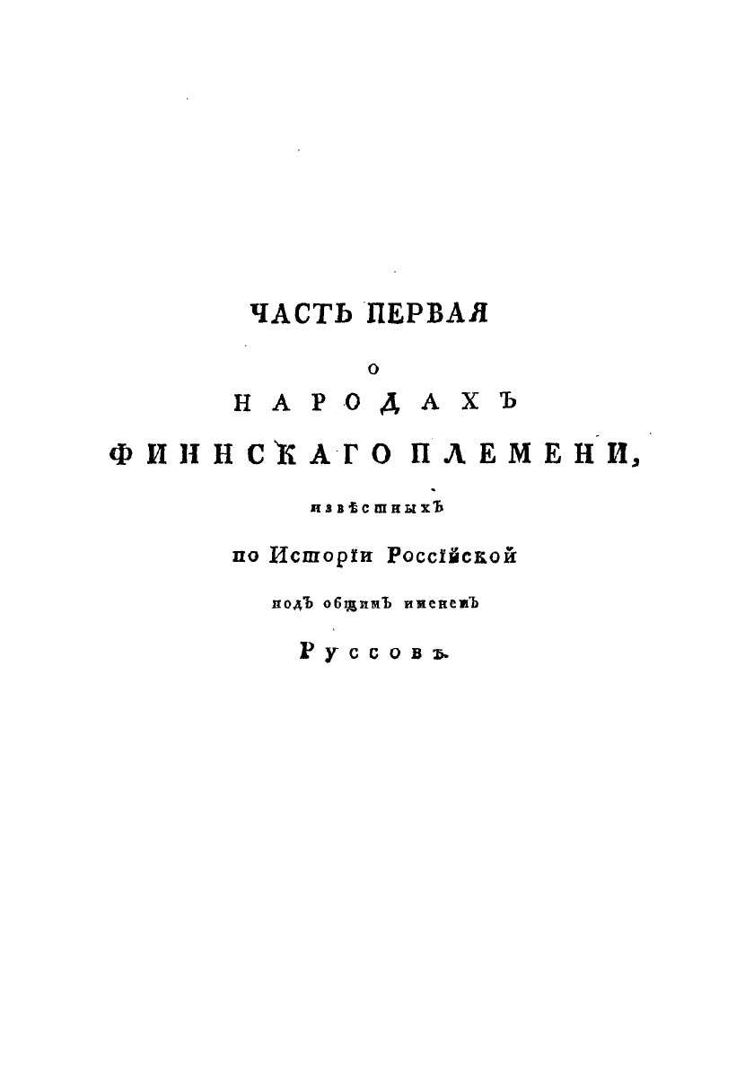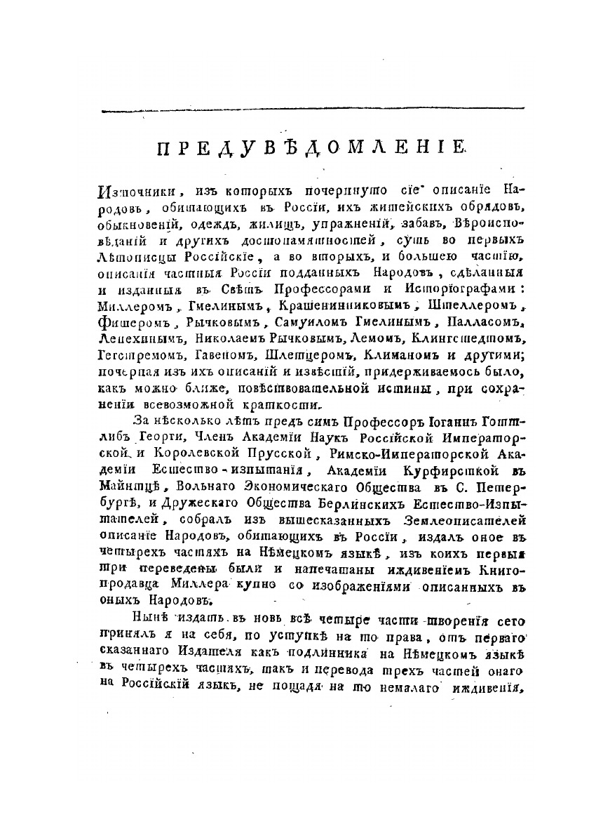 Описание всех обитающих в Российском государстве народов. Их житейских обрядов, обыкновений, одежд, жилищ, упражнений, забав, вероисповеданий и других достпамятностей. Творение, за несколько лет перед сим на Немецком языке Иоанна Готтлиба Георги, в переводе на Российский язык, весьма во многом исправленное и вновь сочиненное. В четырех частях. Со 100 гравированными изображениями Народов и 8 виньетами. Часть первая. О народах финнского племени, известных по истории российской под общим именем Руссов.