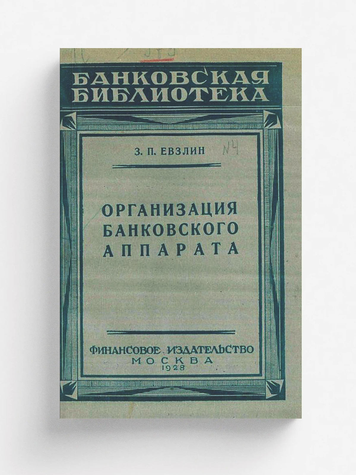 Евзлин, Захарий Петрович (1869–). Организация банковского аппарата / З. П. Евзлин. — Москва : Финансовое изд-во НКФ СССР, 1928 (Л. : гос. тип. им. Евг. Соколовой). — 63, [2] с.; 20?13 см.