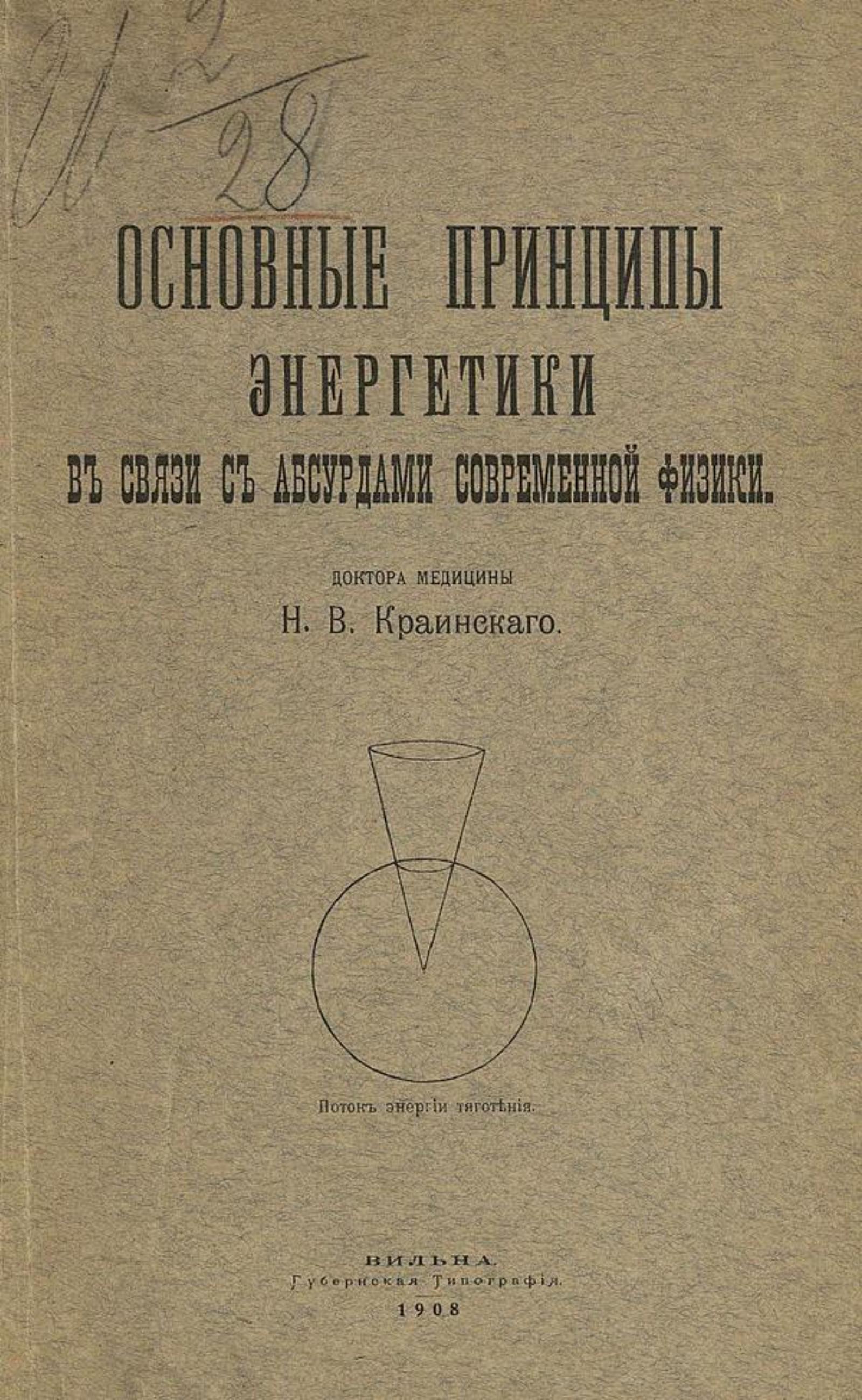 Краинский, Николай Васильевич (1869–). Основные принципы энергетики в связи с абсурдами современной физики / [Соч.] Д-ра мед. Н. В. Краинского. — Вильна: Губ. тип., 1908. — 345 с. : черт.; 28.