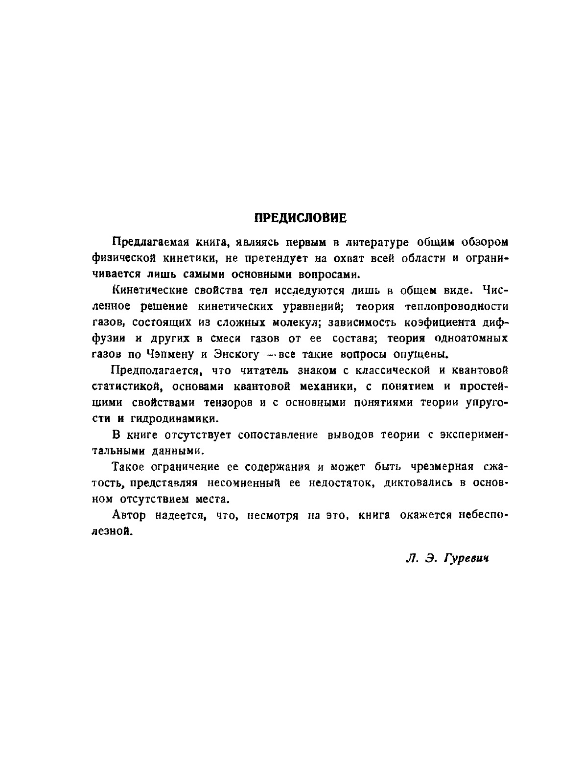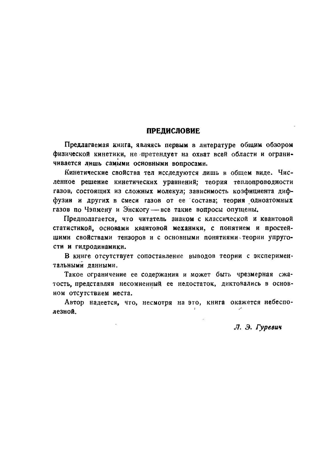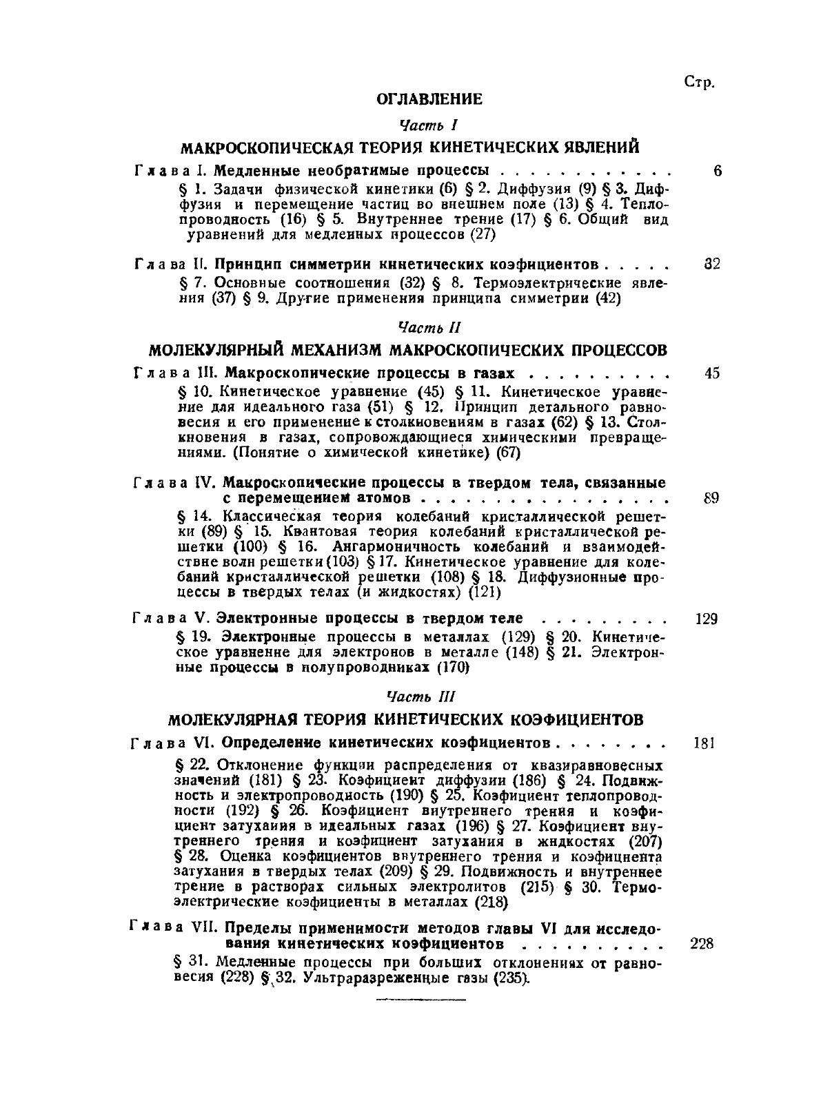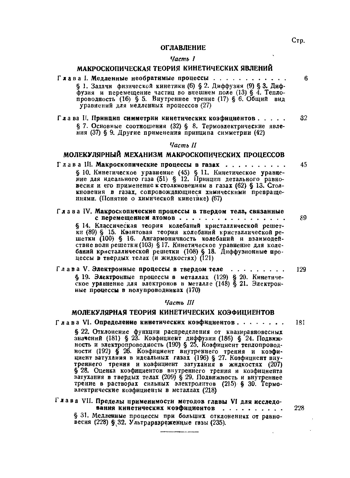 Предлагаемая книга, являясь первым в литературе общим обзором физической кинетики, не претендует на охват всей области и ограничивается лишь самыми основными вопросами. Кинетические свойства тел исследуются лишь в общем виде. Численное решение кинетических уравнений; теория теплопроводности газов, состоящих из сложных молекул; зависимость коэффициента диффузии и других в смеси газов от ее состава; теория одноатомных газов по Чэпмену и Энскогу все такие вопросы опущены. Предполагается, что читатель знаком с классической и квантовой статистикой, основами квантовой механики, с понятием и простейшими свойствами тензоров и с основными понятиями теории упругости и гидродинамики.