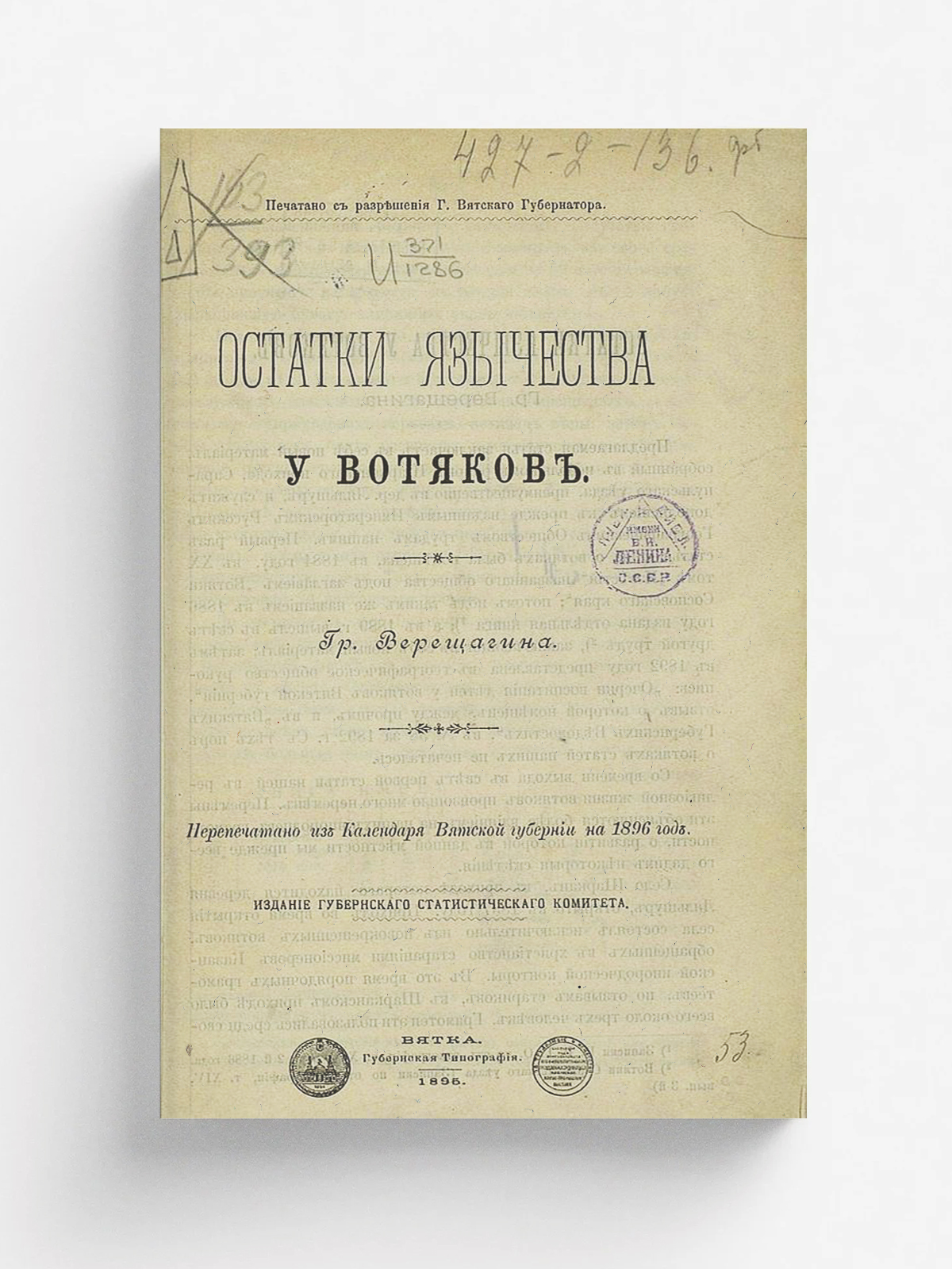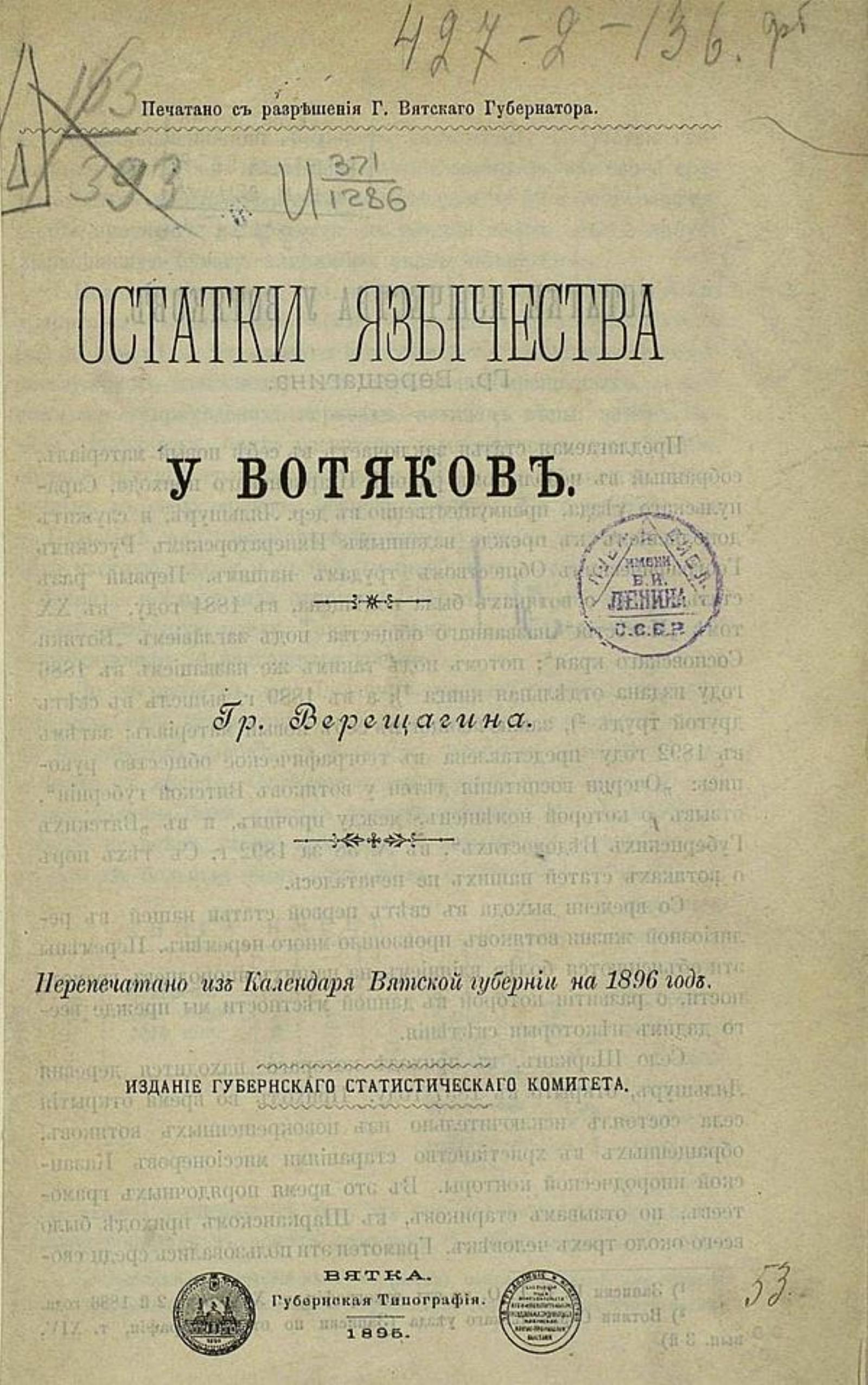 Верещагин, Григорий Егорович (1851–1930). Остатки язычества у вотяков / [Соч.] Гр. Верещагина. — Вятка: Губ. стат. ком., 1895. — 63 с. : черт.; 23.