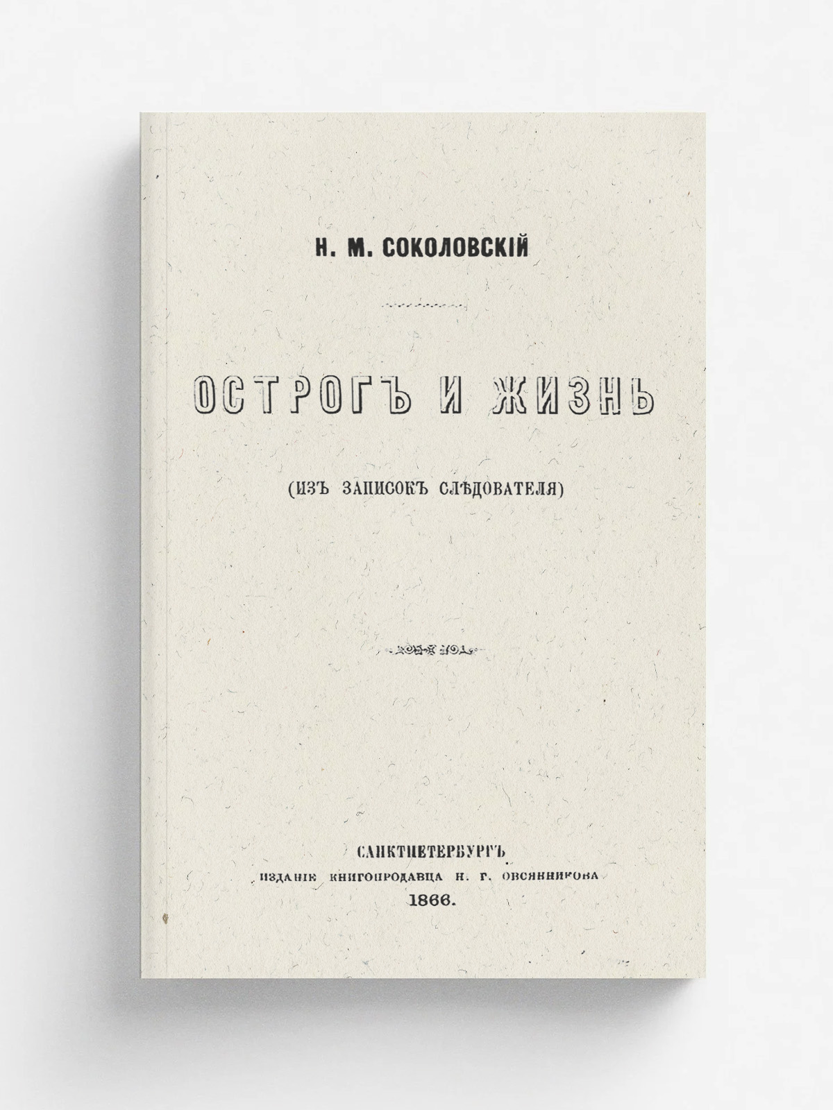 Соколовский, Н. М. Острог и жизнь (Из записок следователя) / [Н. М. Соколовский]. — Санкт-Петербург: Изд-во книгопродавца Н. Г. Овсянникова, 1866. — [4], 509, [4] с.; 21