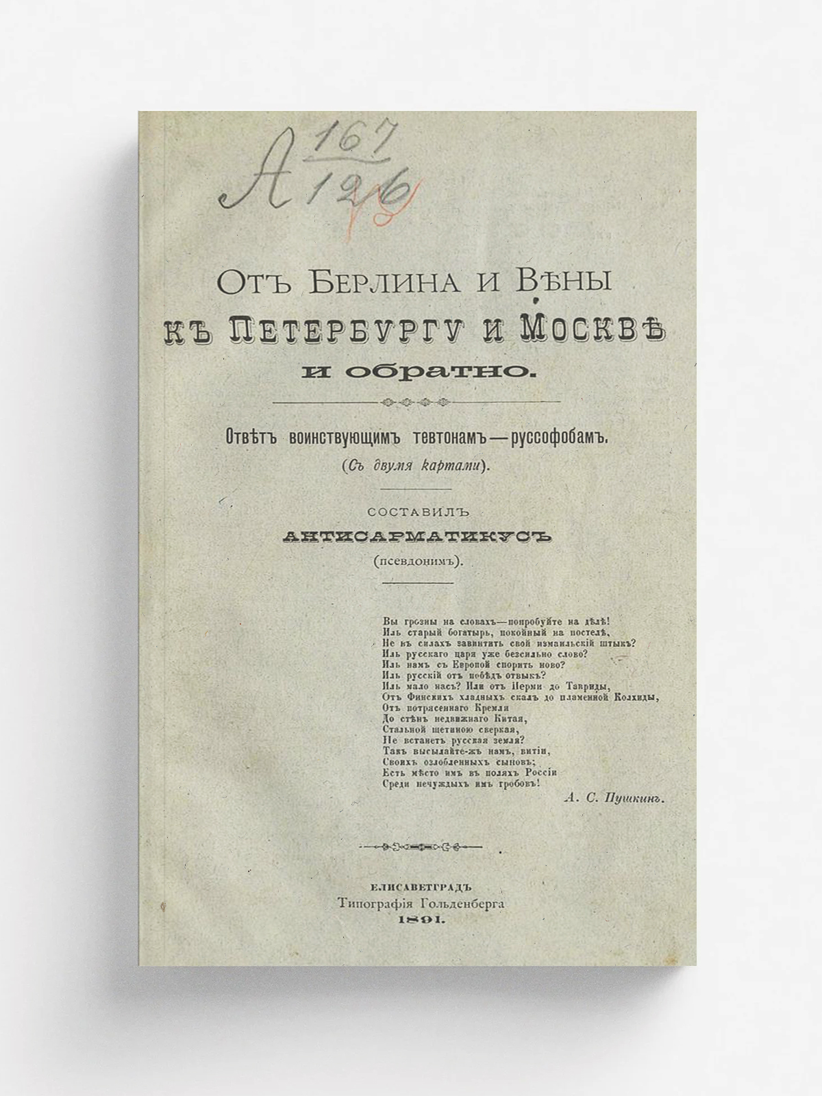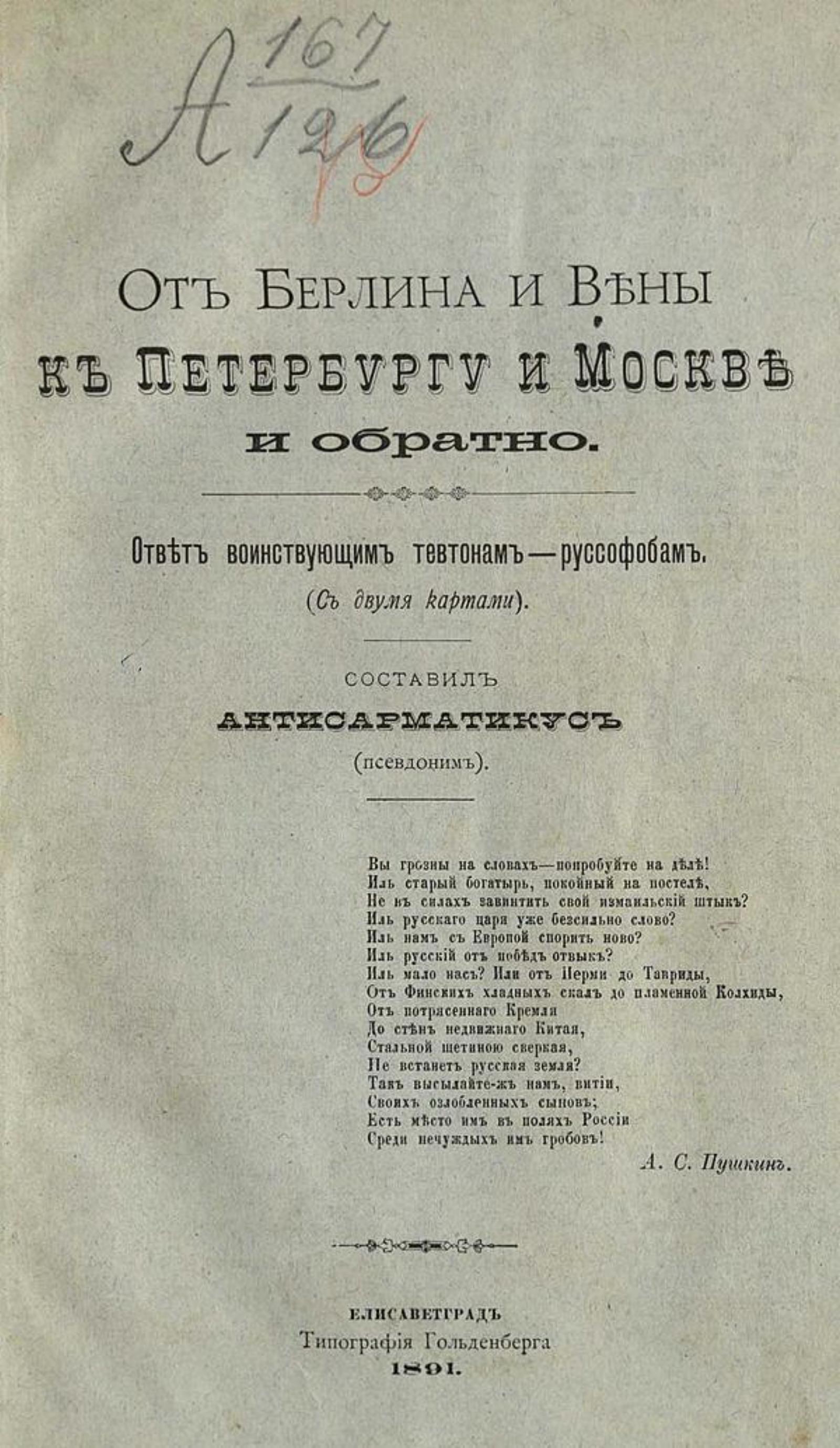Гейсман, Платон Александрович (1853–1919). От Берлина и Вены к Петербургу и Москве и обратно. Ответ воинствующим тевтонам-руссофобам (с 2-мя картами) / сост. Антисарматикус (псевд.). — Елисаветград: Тип. Гольденберга, 1891. — 146, [1] с., 2 л. карт.; 24 см.