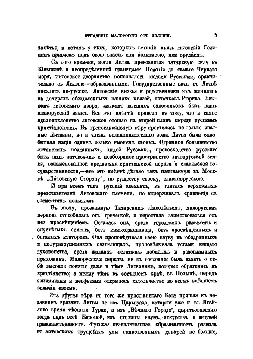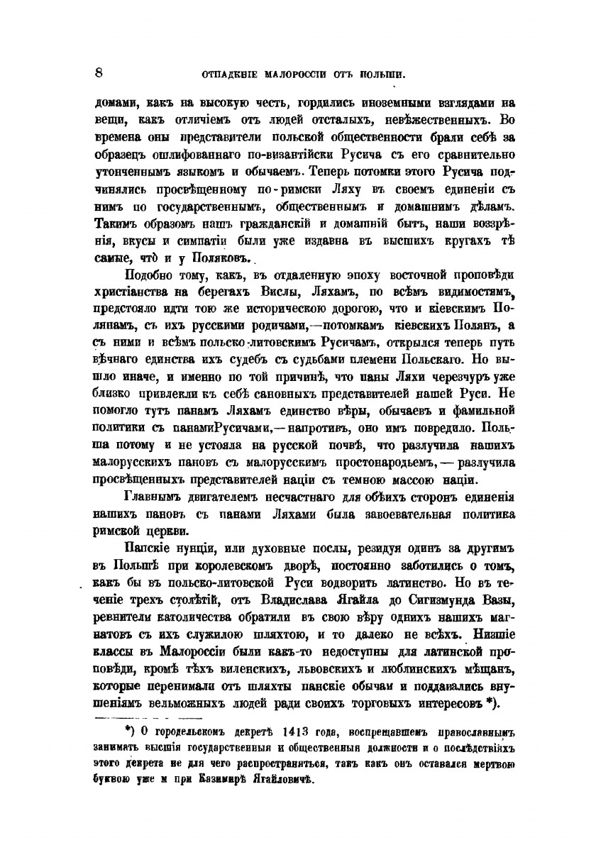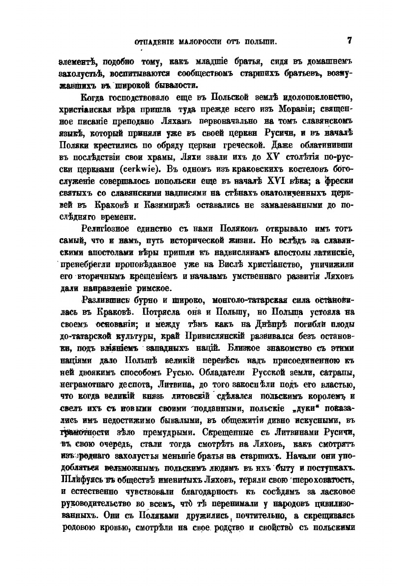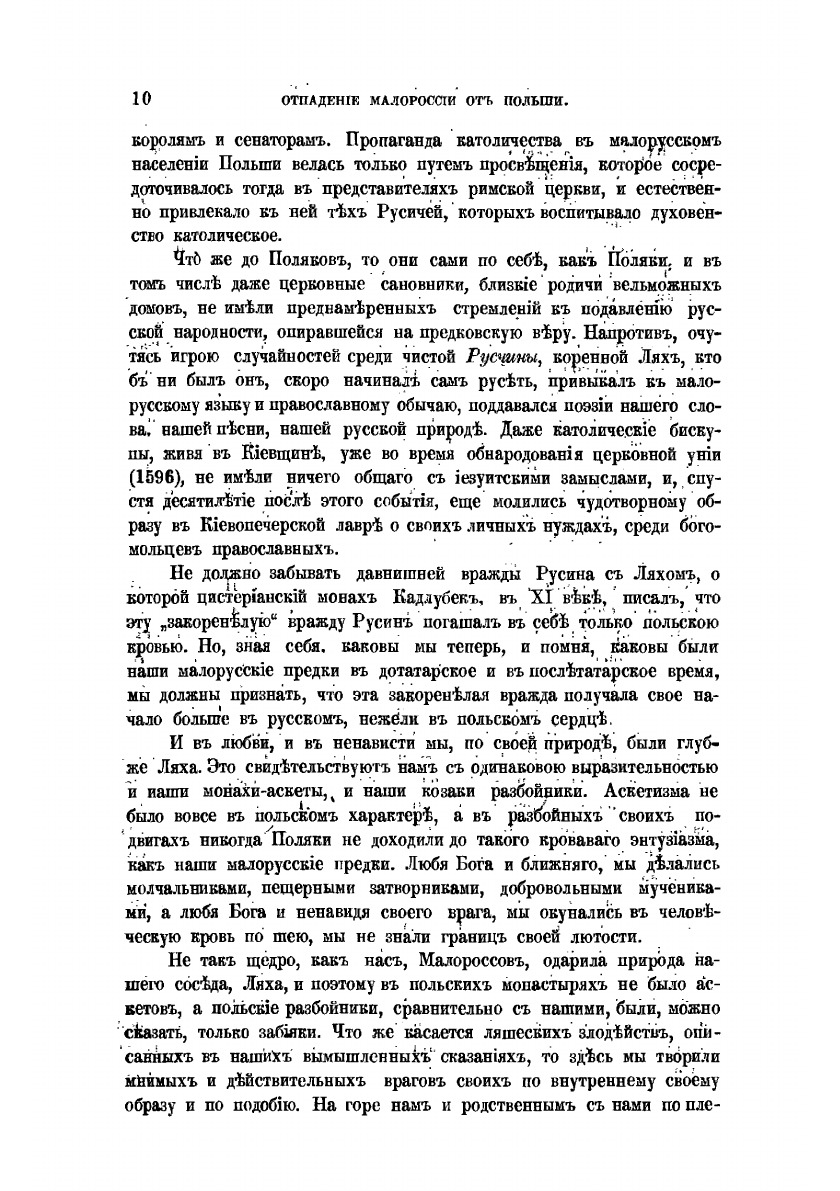 “Отпадение Малороссии от Польши” - продолжение исторического исследования “История воссоединения Руси”, в которых П.А Кулиш указывает на разрушительные тенденции, возникавшие с помощью внешних сил, стремившихся превратить Червоную Русь в оплот украинства-антирусизма. Кулиш убедительно показывает разлагающее влияние запорожской вольницы, этих “диких по-восточному представителей охлократии” – на судьбы Отчизны.