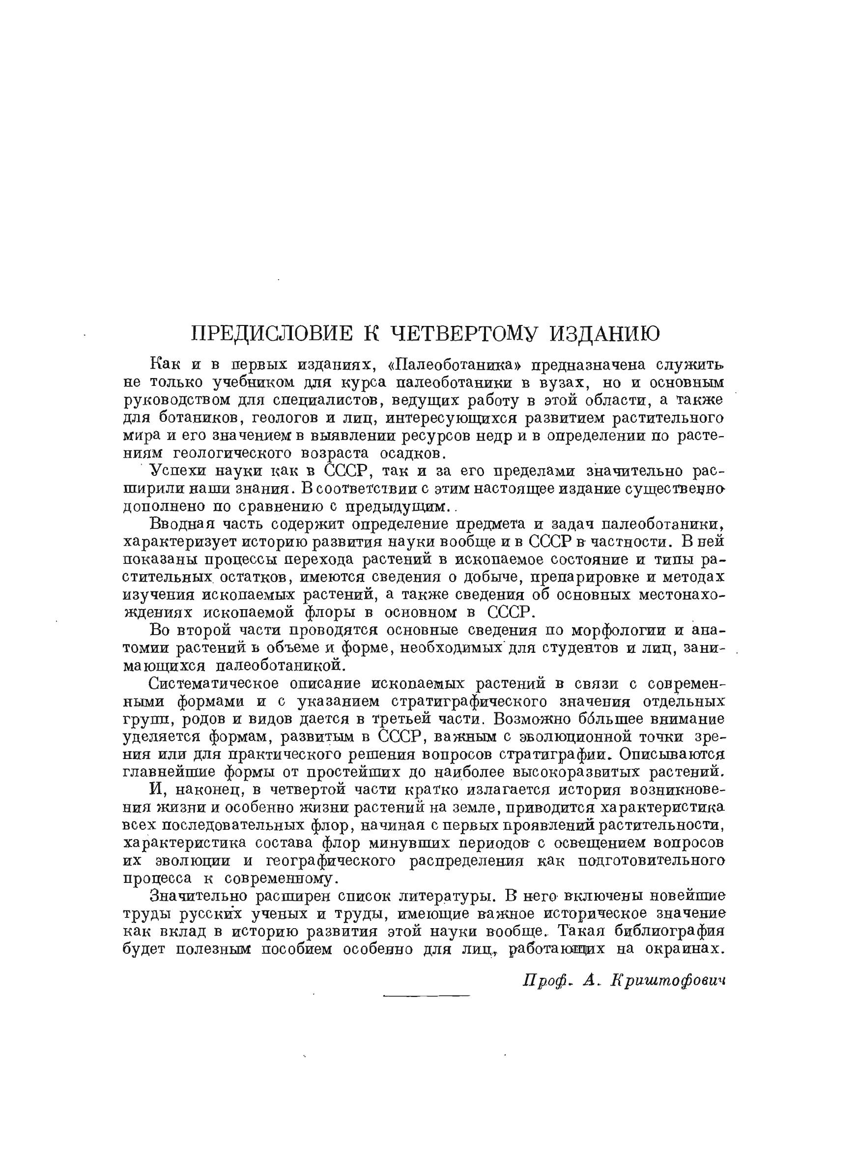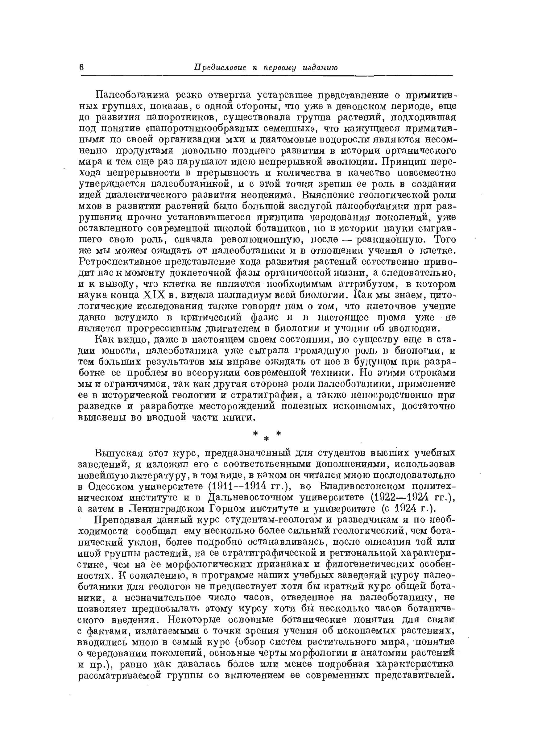 Как и в первых изданиях, «Палеоботаника» предназначена служить, не только учебником для курса палеоботаники в вузах, но и основным руководством для специалистов, ведущих работу в этой области, а также для ботаников, геологов и лиц, интересующихся развитием растительного мира и его значением в выявлении ресурсов недр и в определении по растениям геологического возраста осадков.Успехи науки как в СССР, так и за его пределами значительно расширили наши знания. В соответствии с этим настоящее издание существенно-дополнено по сравнению с предыдущим..Вводная часть содержит определение предмета и задач палеоботаники, характеризует историю развития науки вообще и в СССР в частности. В ней показаны процессы перехода растений в ископаемое состояние и типы растительных остатков, имеются сведения о добыче, препарировке и методах изучения ископаемых растений, а также сведения об основных местонахождениях ископаемой флоры в основном в СССР. Во второй части проводятся основные сведения по морфологии и анатомии растений ь объеме и форме, необходимых для студентов и лиц, занимающихся палеоботаникой. Систематическое описание ископаемых растений в связи с современными формами и с указанием стратиграфического значения отдельных групп, родов и видов дается в третьей части. Возможно большее внимание уделяется формам, развитым в СССР, важным с эволюционной точки зрения или для практического решения вопросов стратиграфии. Описываются главнейшие формы от простейших до наиболее высокоразвитых растений. И, наконец, в четвертой части кратко излагается история возникновения жизни и особенно жизни растений на земле, приводится характеристика всех последовательных флор, начиная с первых проявлений растительности, характеристика состава флор минувших периодов с освещением вопросов их эволюции и географического распределения как подготовительного процесса к современному. Значительно расширен список литературы. В него включены новейшие труды русских ученых и труды, имеющие важное историческое значение как вклад в историю развития этой науки вообще. Такая библиография будет полезным пособием особенно для лиц, работающих на окраинах.
