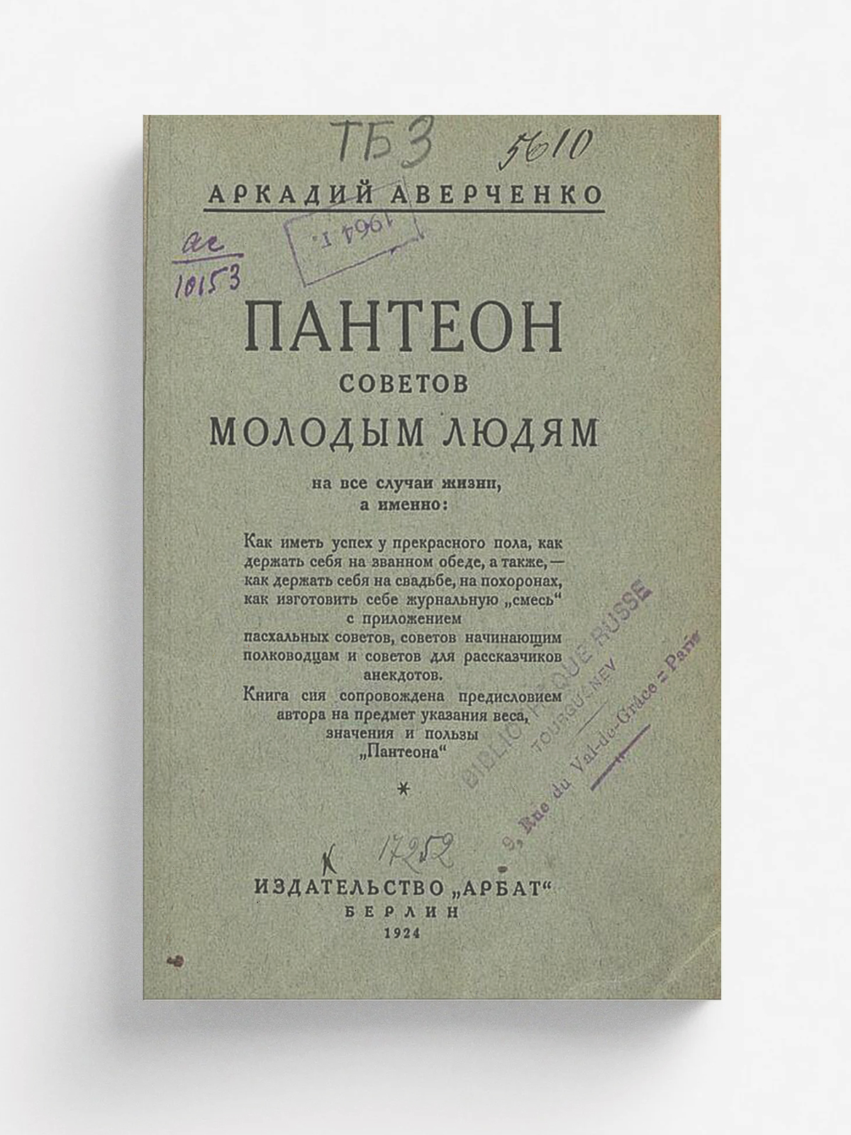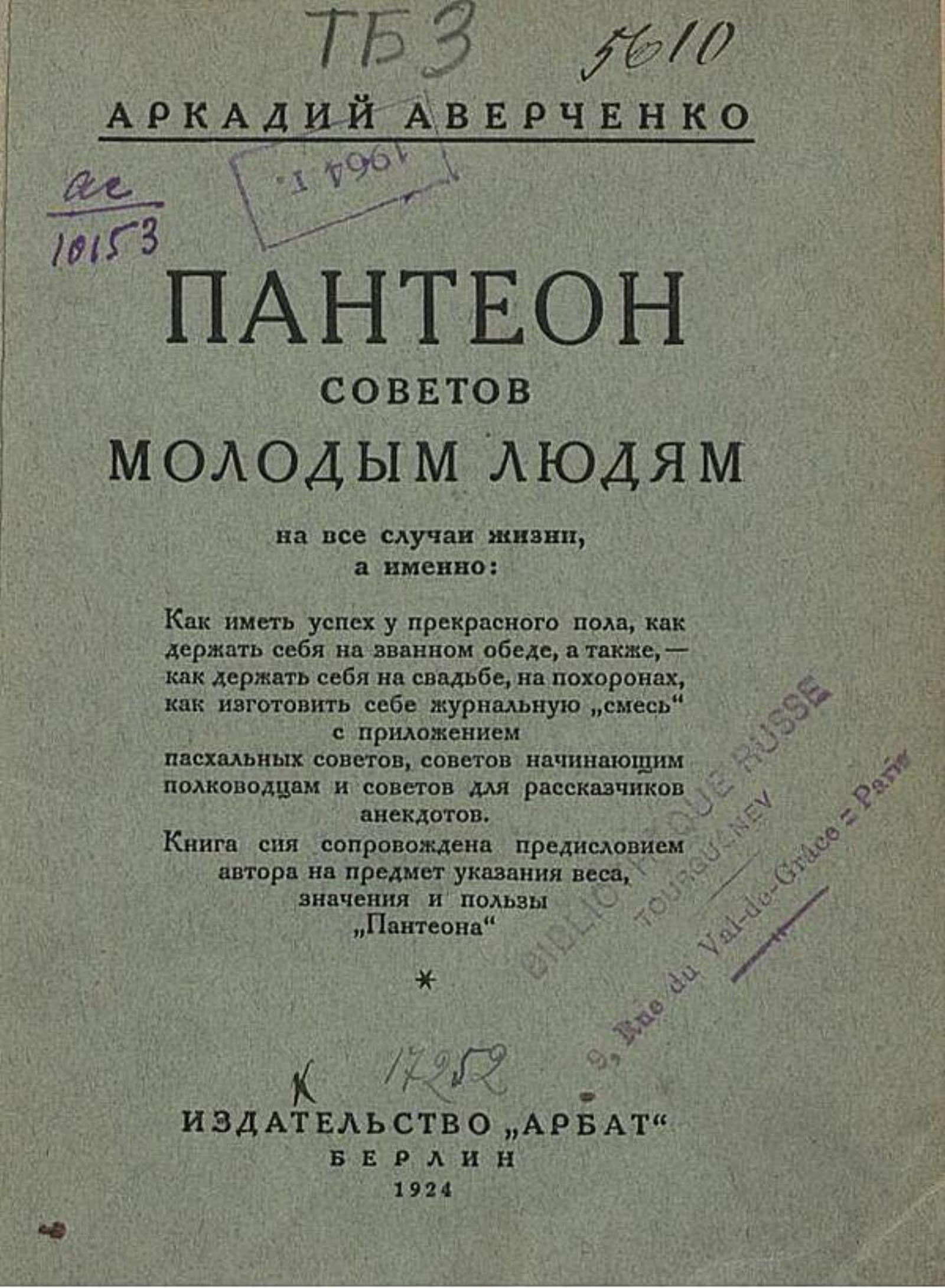 Аверченко А. Т. Пантеон советов молодым людям, или Вернейшие способы, как иметь успех в жизни. — Берлин : Арбат, 1924. — 91 с.; 15 см.