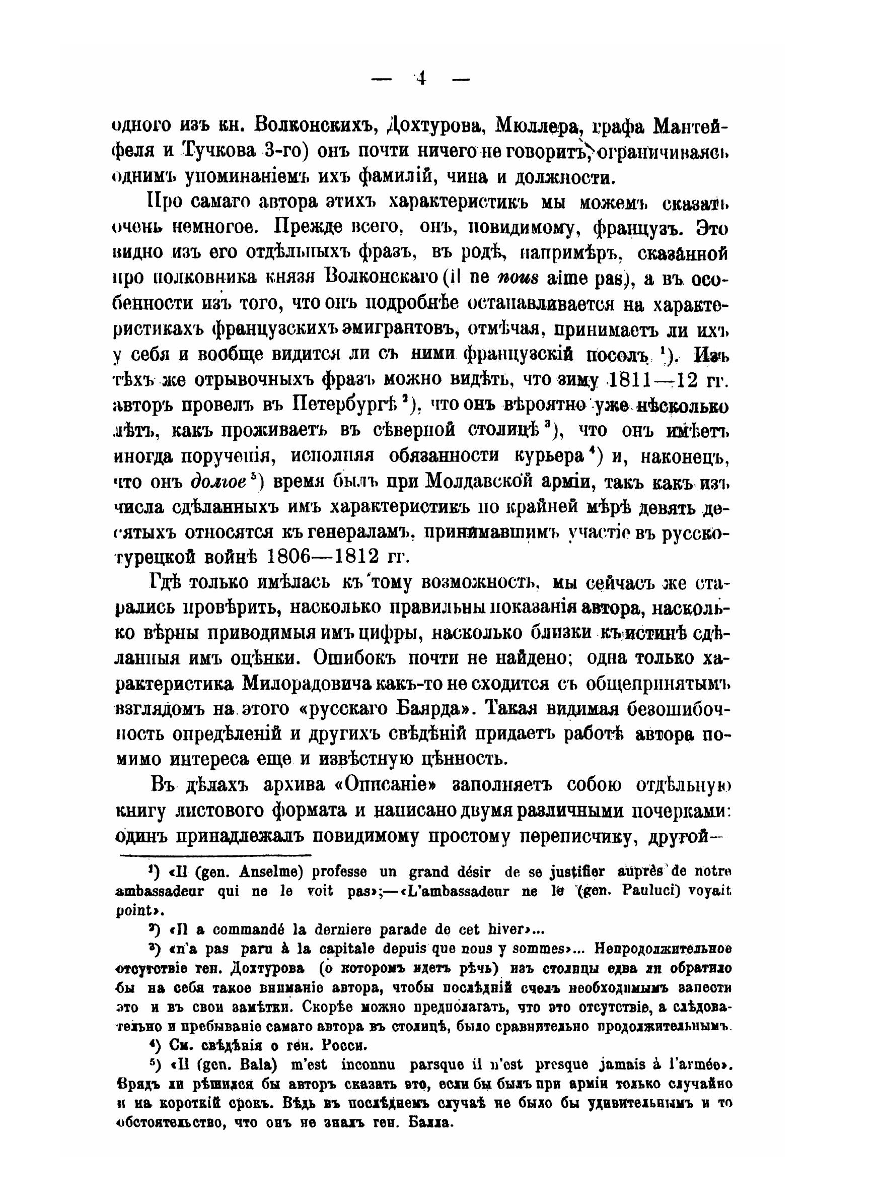 В книге приведены два интереснейших документа. Один написан французом, по-видимому состоявшим при Петербургском посольстве, а до этого время бывшем при Молдавской армии или в Бухаресте, другой написан полковником Чернышевым, долгое время проживавшим в Париже.Чернышев написал отчет о пяти французских маршалах и трех дивизионных генералах, остальные 25 лиц из его отчета только перечислены по фамилиям и родам войск. Француз же дал сведения о 60 русских генералах. Сведения приведены в известную систему. Характеризуется храбрость генералов, их военные познания, указывается возраст и материальное положение.