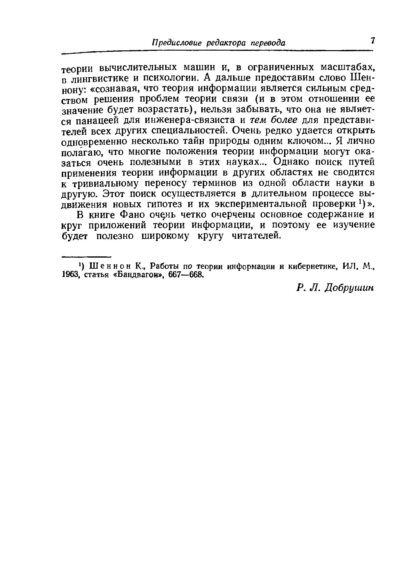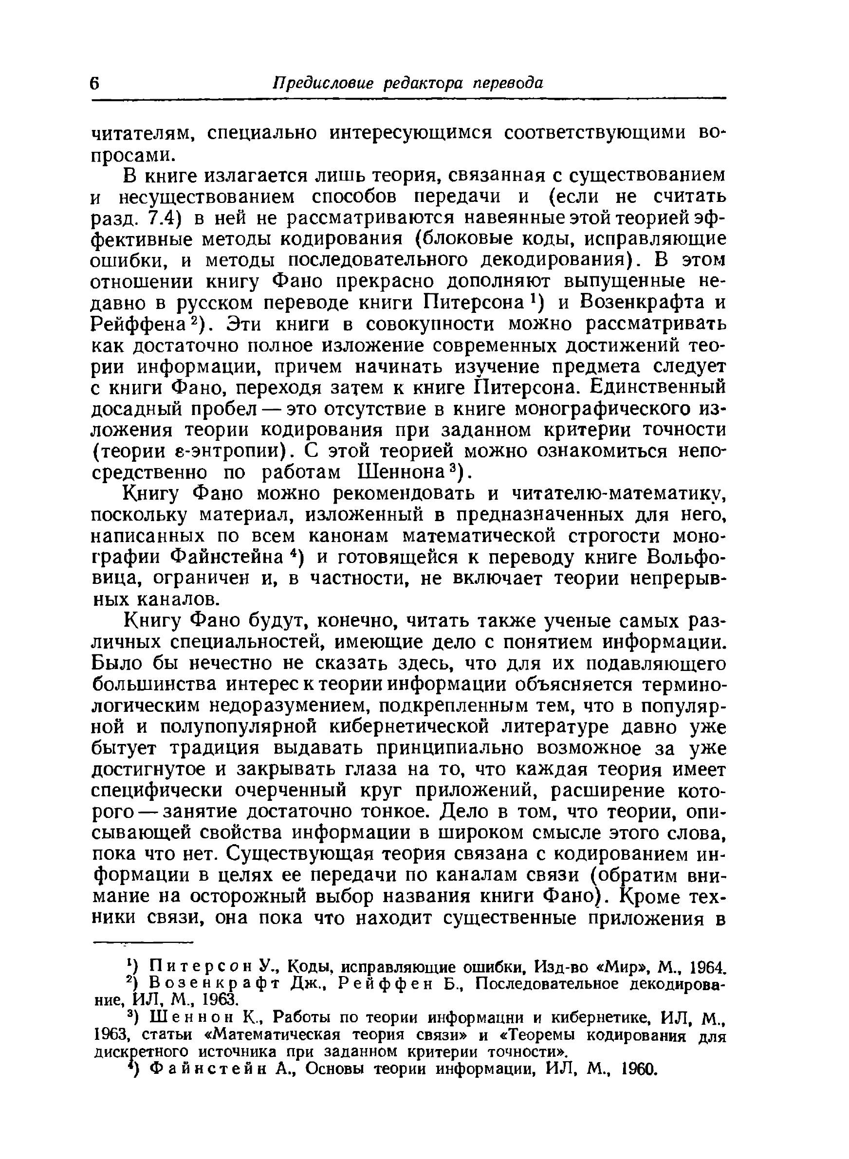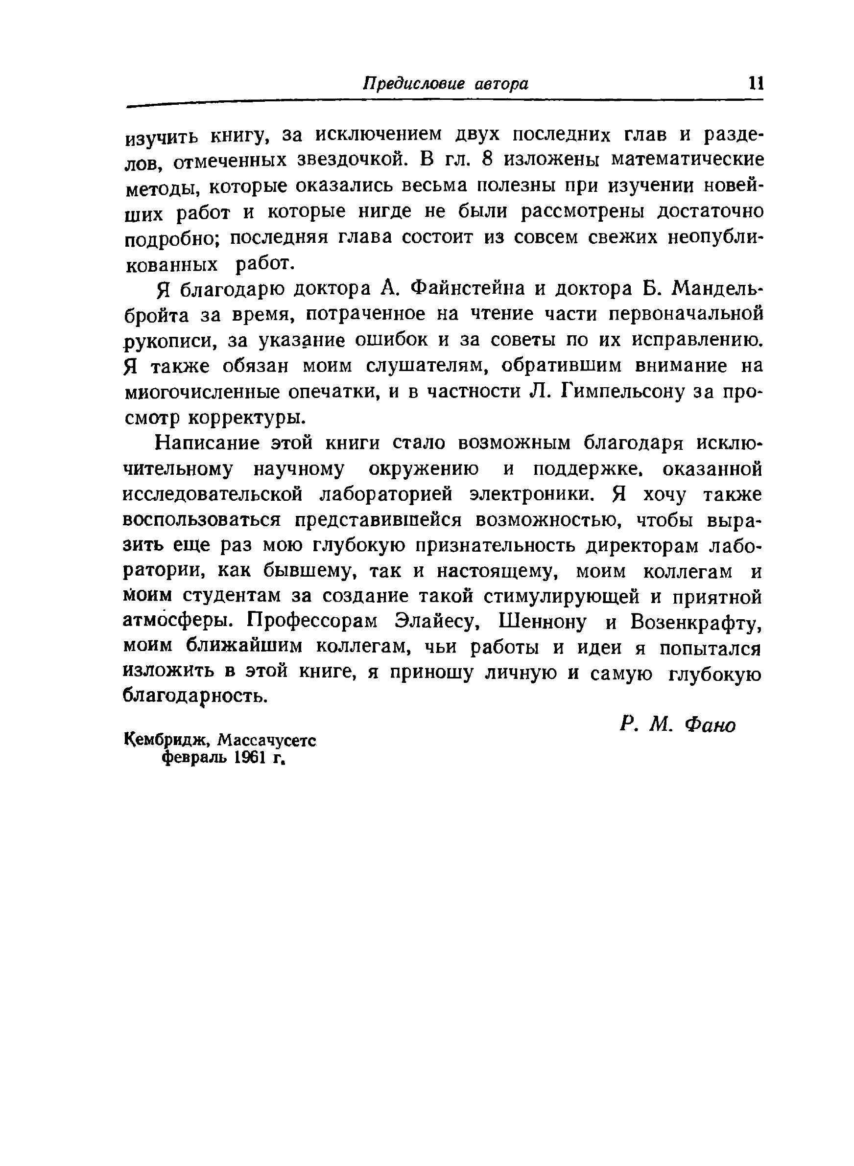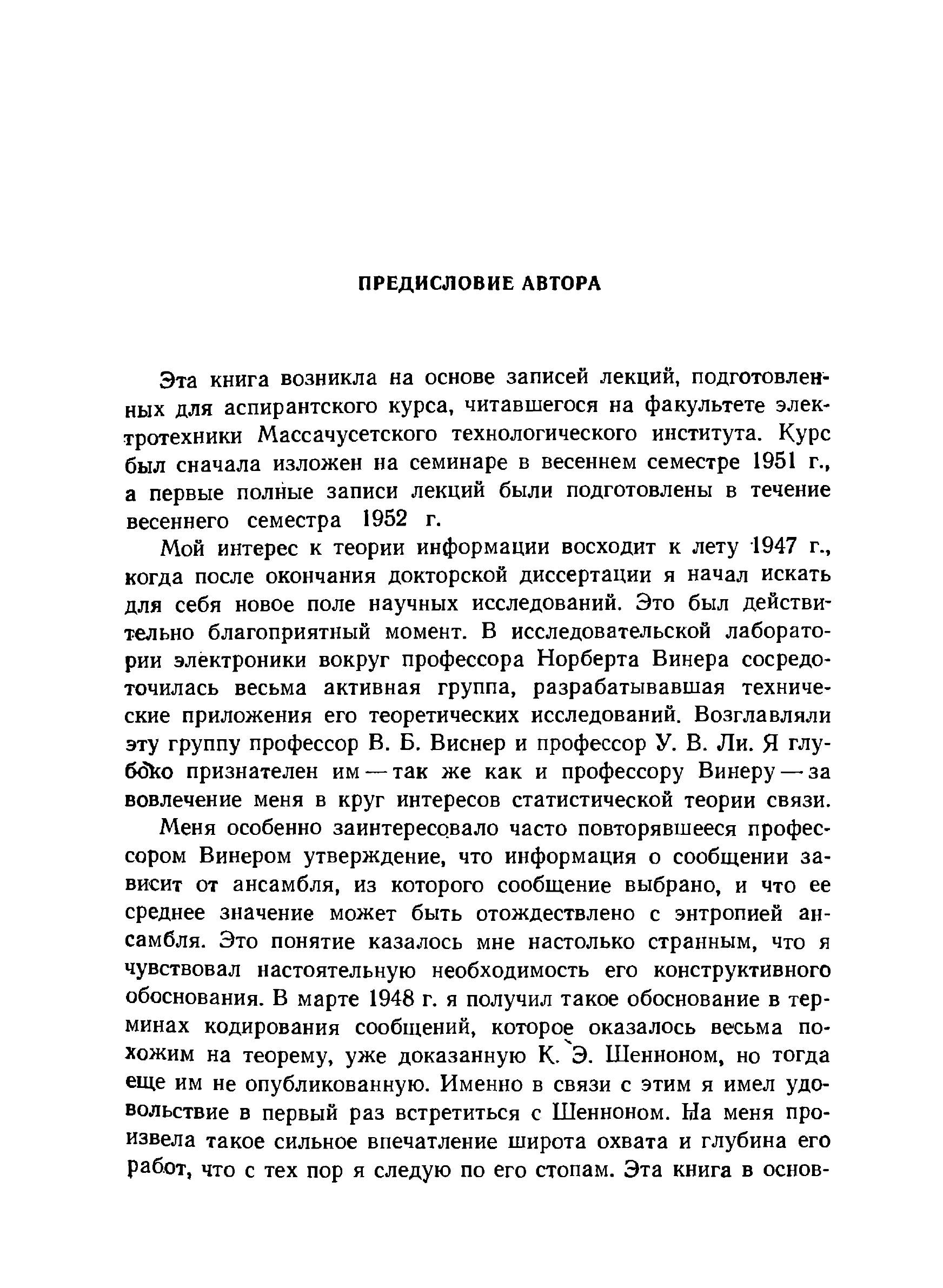 В книге известного американского ученого Р. Фано систематически излагаются основы теории информации; наряду с основополагающими результатами шенноновской теории кодирования приводится ряд новых интересных данных. Подробно исследуются свойства основной меры информации, рассматриваются различные типы источников и каналов передачи информации, в первую очередь дискретные каналы без памяти и гауссовские каналы. Автор широко использует физическую интерпретацию изучаемого материала и приводит многочисленные примеры. Большое количество хорошо подобранных задач позволяет читателю закрепить полученные знания. Книга предназначена для научных работников и инженеров, занимающихся теорией информации и теорией связи, а также для математиков, интересующихся приложениями своей науки. Она может служить учебным пособием для студентов и аспирантов соответствующих специальностей.