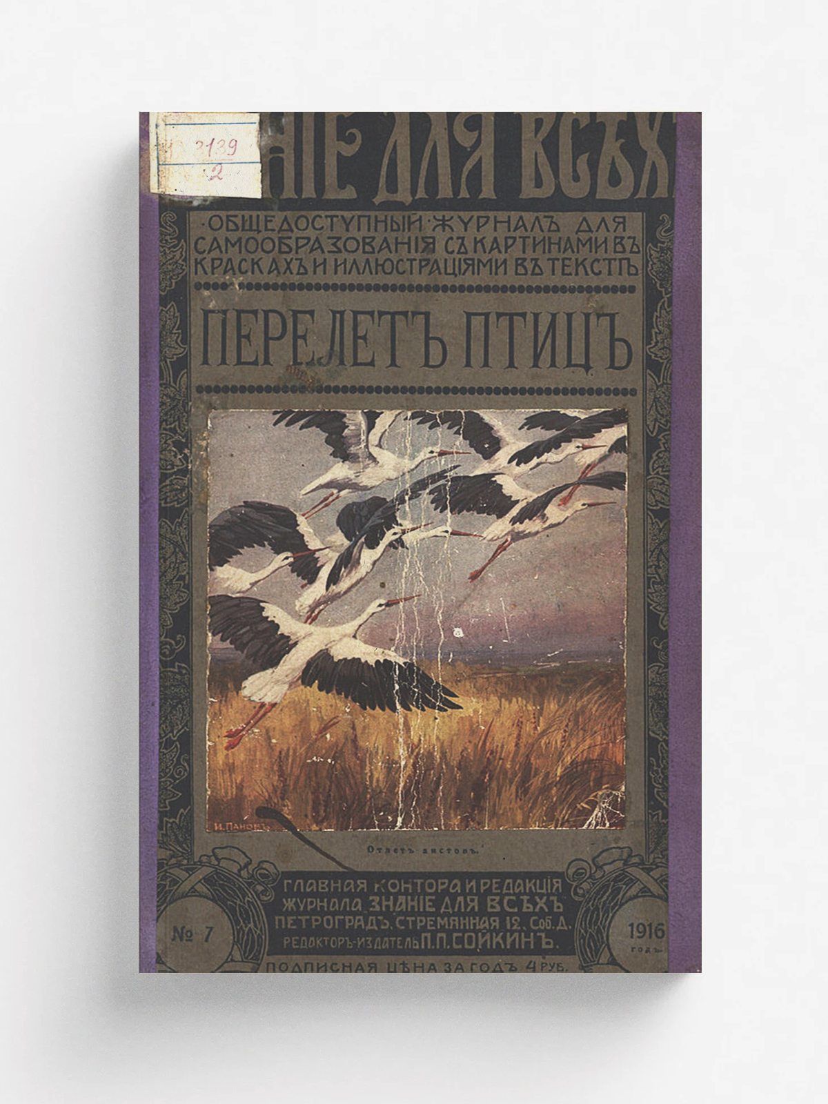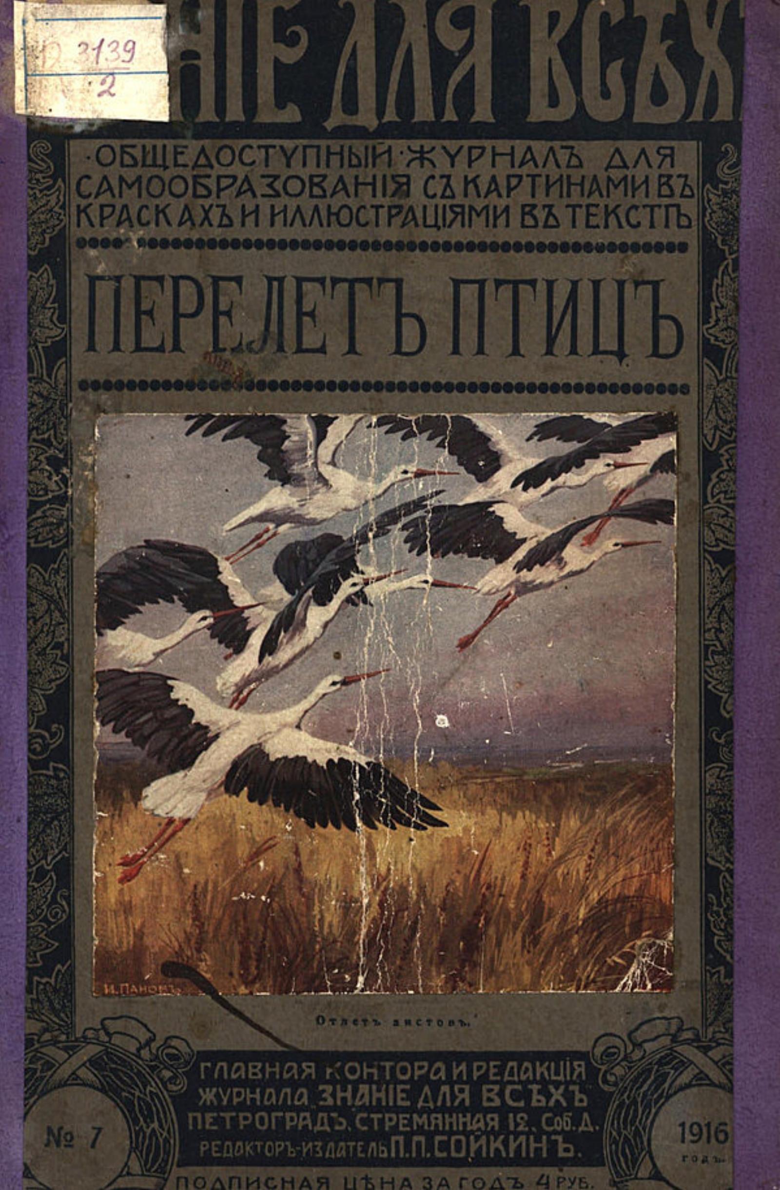 Анфилов, Владимир Константинович (1863–). Перелеты птиц : Очерк В. К. Анфилова. — Петроград : П. П. Сойкин, 1916. — 32 с., 2 л. цв. ил., карт. : ил.; 26. — (Знание для всех : Общедоступ. журн. для самообразования...; 1916, № 7).