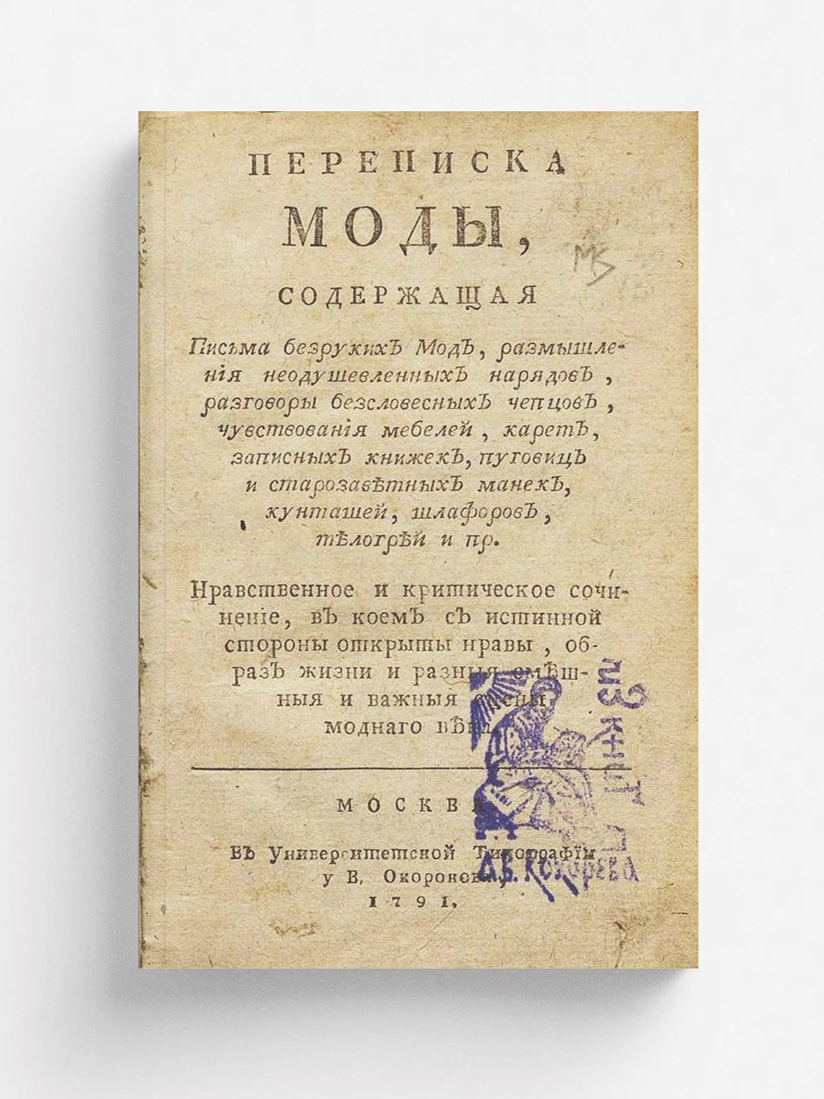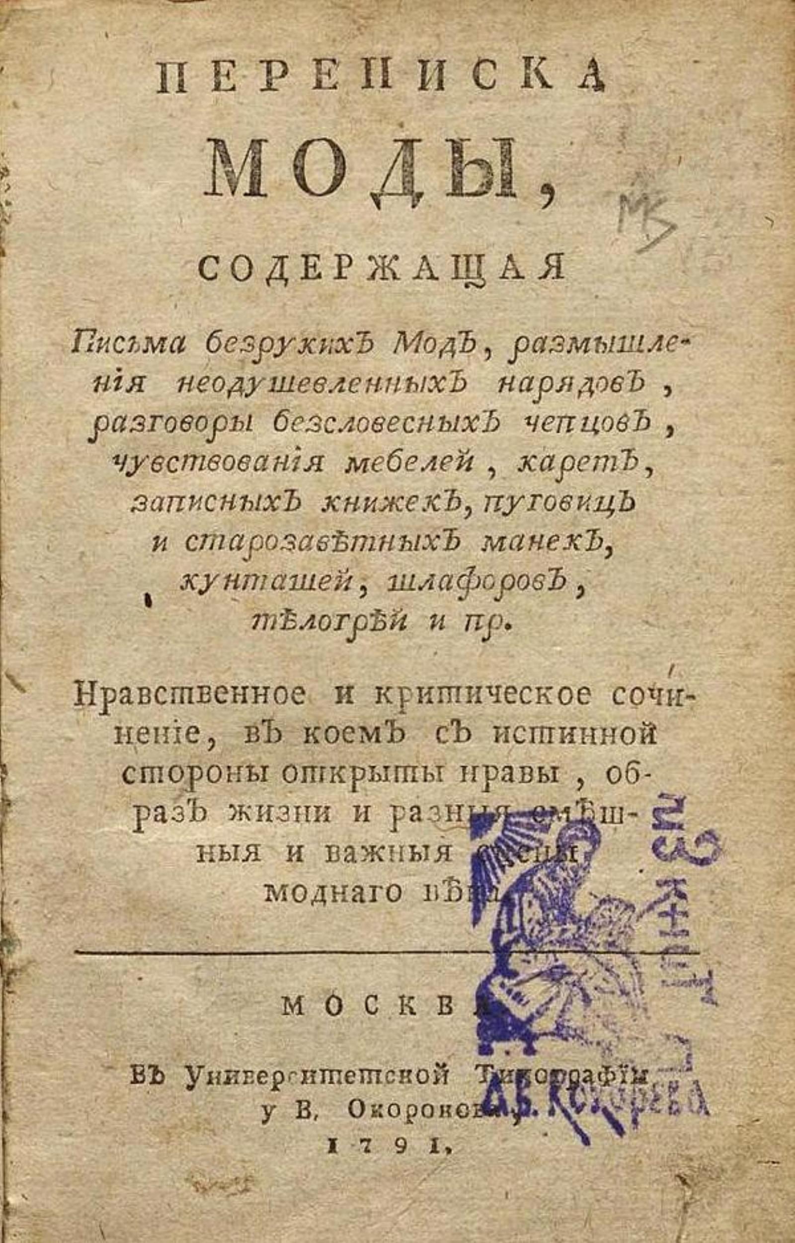 Страхов, Николай Иванович. Переписка моды, : Содержащая письма безруких мод, размышления неодушевленных нарядов, разговоры безсловесных чепцов, чувствования мебелей, карет, записных книжек, пуговиц и старозаветных манек, кунташей, шлафоров, телогрей и пр. : Нравственное и критическое сочинение, в коем с истинной стороны открыты нравы, образ жизни и разныя смешныя и важныя сцены моднаго века. — Москва : Унив. тип., у В. Окорокова, 1791. — XX, 238 с.; 8°.