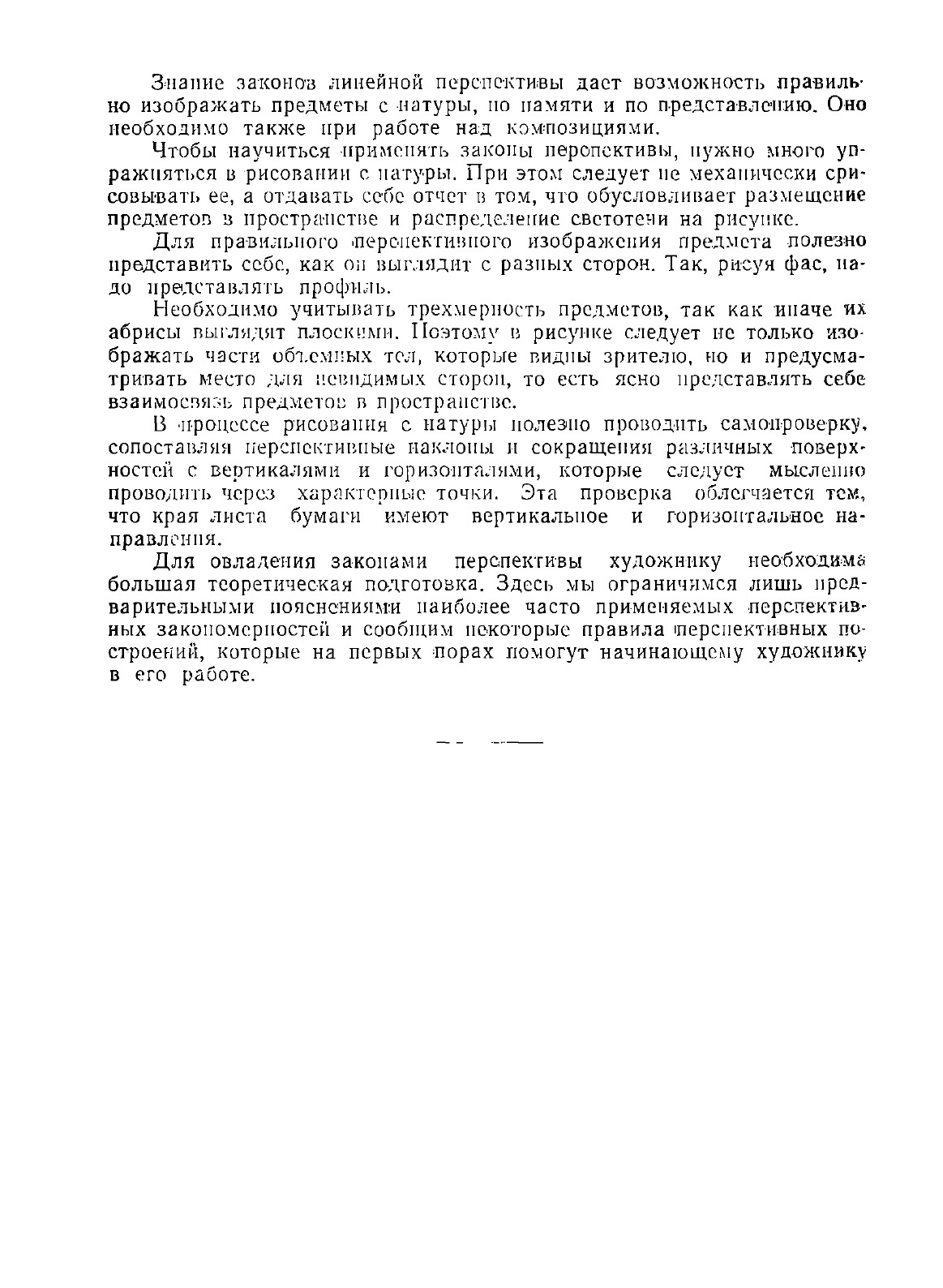 Для овладения законами перспективы художнику необходима большая теоретическая подготовка. Здесь мы ограничимся лишь предварительными пояснениями наиболее часто применяемых перспективных закономерностей и сообщим некоторые правила перспективных построений, которые на первых порах помогут начинающему художнику в его работе. Треть книги составляют рисунки со способами построения перспективы.