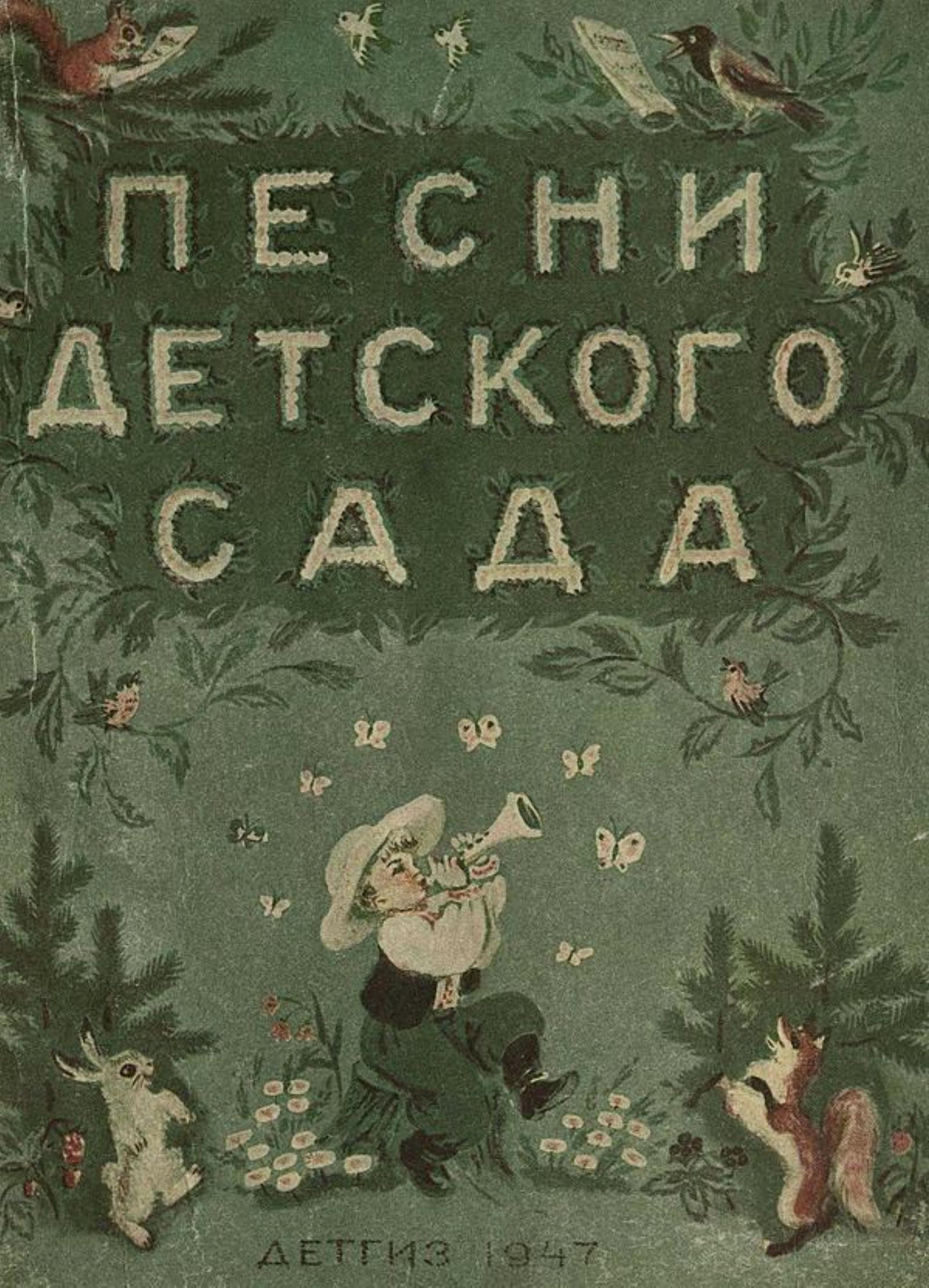 Дзержинская, Юлия Владимировна. Песни детского сада. Вып. 1 / Сост. Ю. Дзержинская и Н. Метлов ; Рис. М. Бутровой. — Москва ; Ленинград : изд-во и ф-ка дет. книги Детгиза, 1947 (Москва). — 80 с. : ил., нот.; 26 см.
