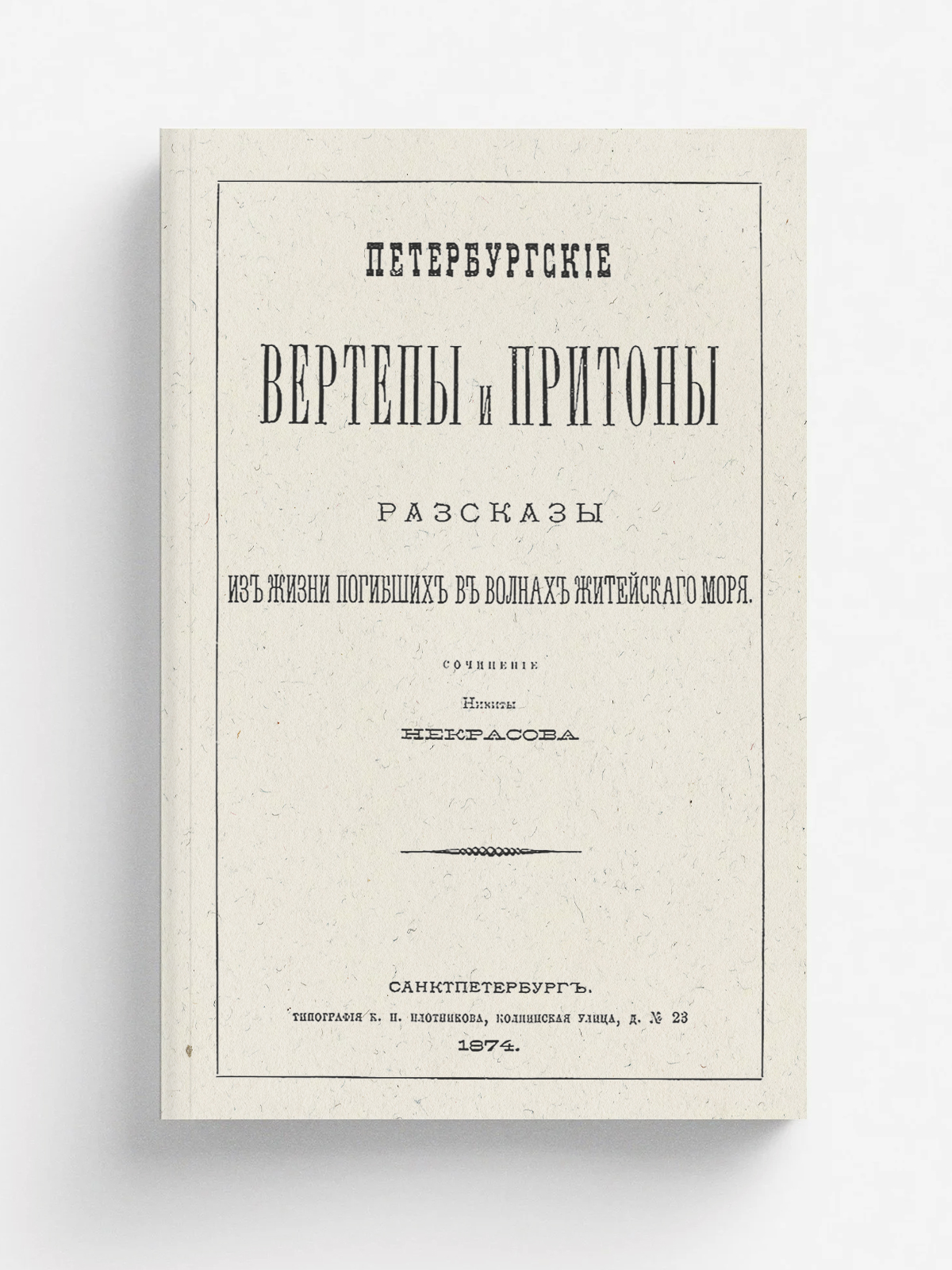 Некрасов, Никита. Петербургские вертепы и притоны : Рассказы из жизни погибших в волнах житейского моря / Соч. Никиты Некрасова. — Санкт–Петербург : тип. К. Н. Плотникова, 1874. — [4], 164 с.; 21.
