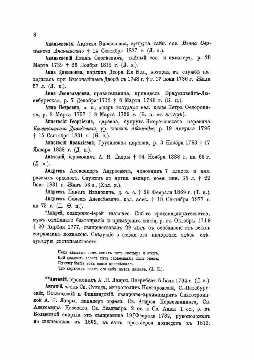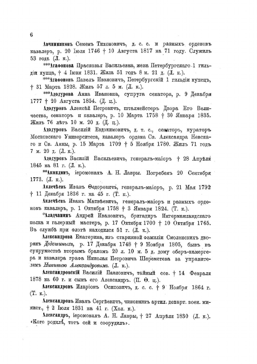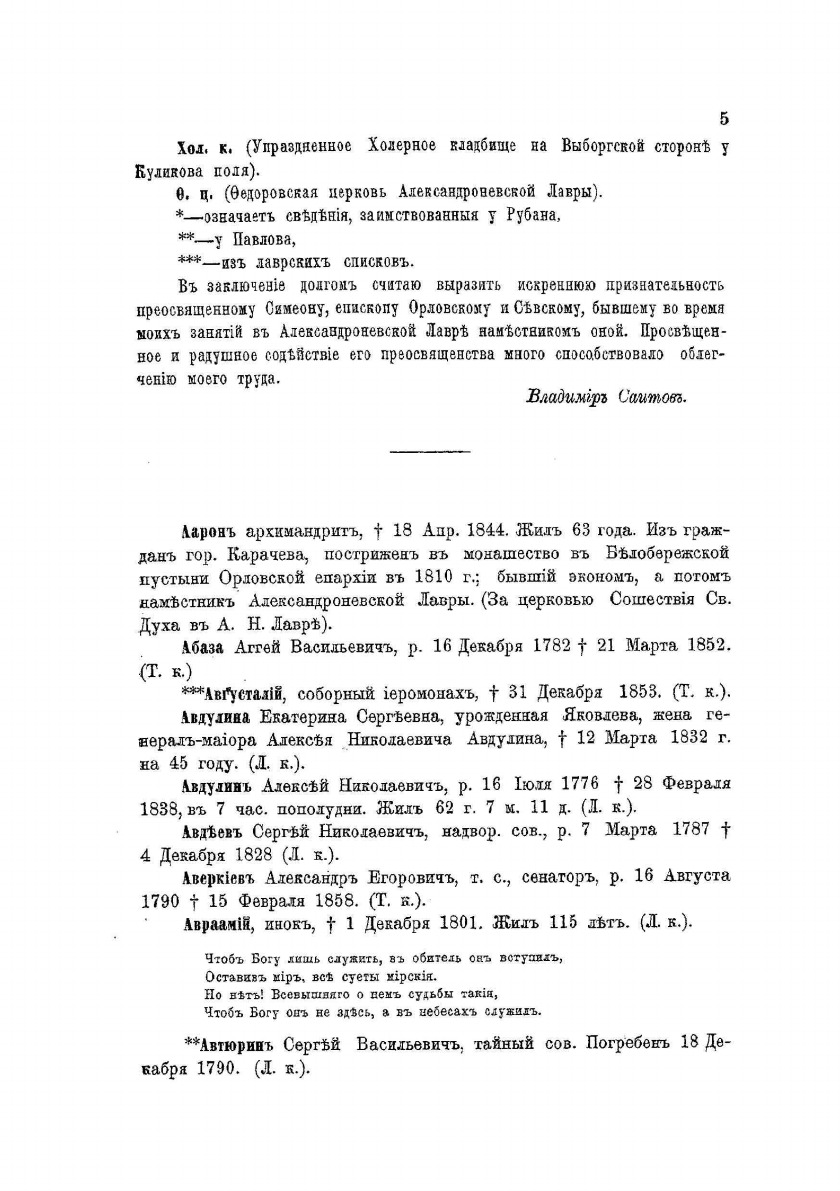 Петербургский некрополь или справочный исторический указатель лиц, родившихся в XVII и XVIII столетиях. По надгробным надписям Александро-Невской лавры и упраздненных петербургских кладбищ. Составил Владимир Саитов. Приложение к "Русскому архиву".