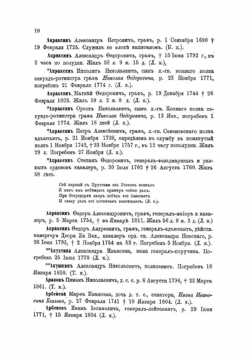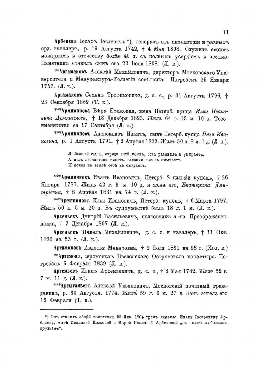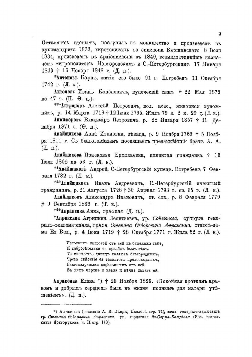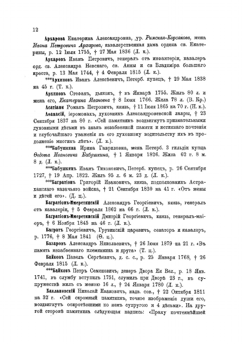 Петербургский некрополь или справочный исторический указатель лиц, родившихся в XVII и XVIII столетиях. По надгробным надписям Александро-Невской лавры и упраздненных петербургских кладбищ. Составил Владимир Саитов. Приложение к "Русскому архиву".