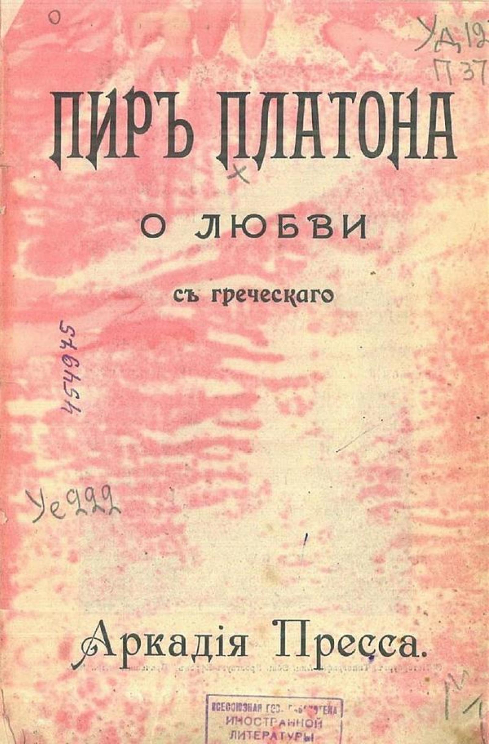 Платон. Пир : О любви / [Соч.] Платона; С греч. [пер.] Аркадия Пресса. — [2-е изд.]. — Санкт-Петербург : тип. АО Брокгауз-Ефрон, [1910]. — 80 с. : ил.; 23.