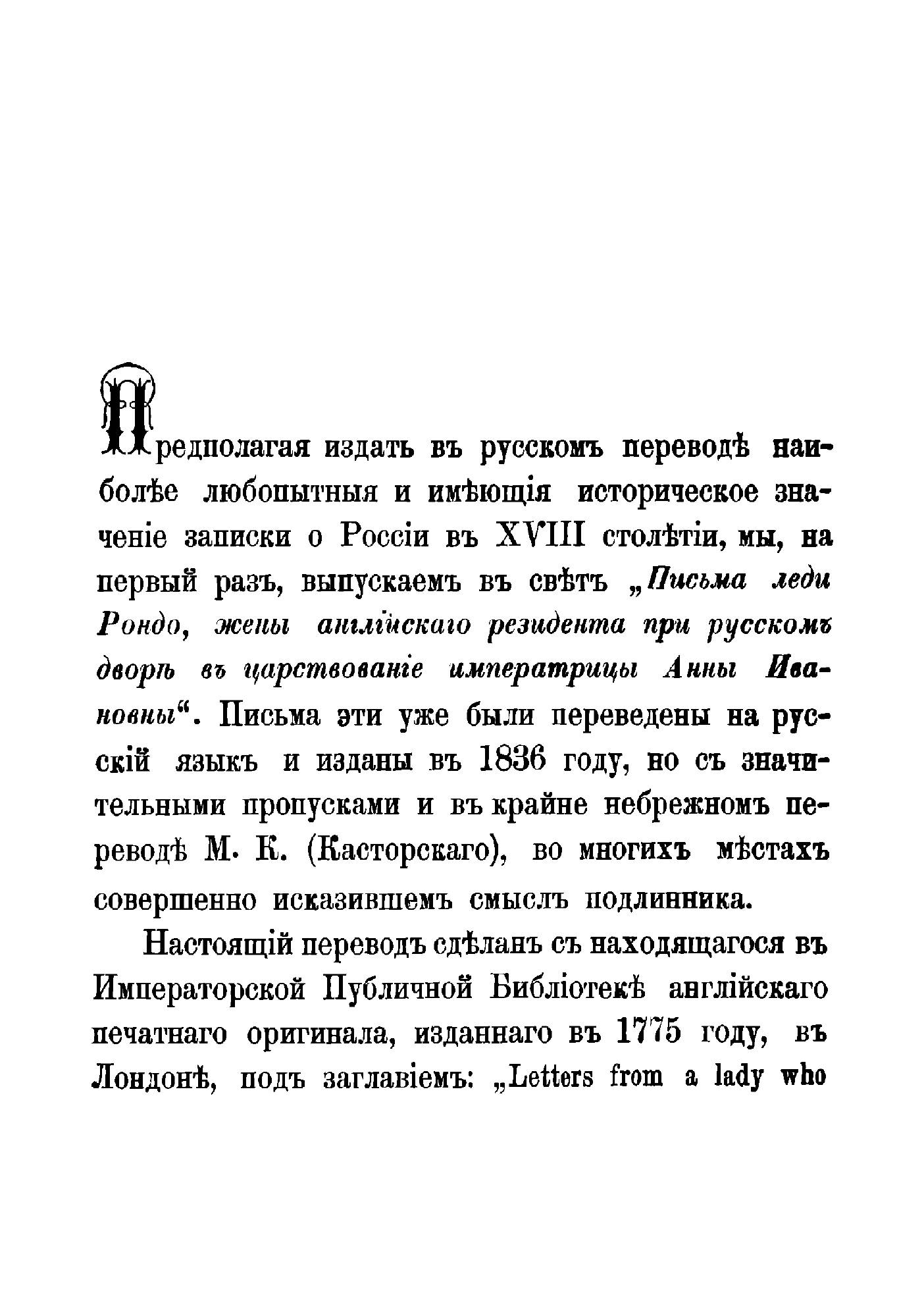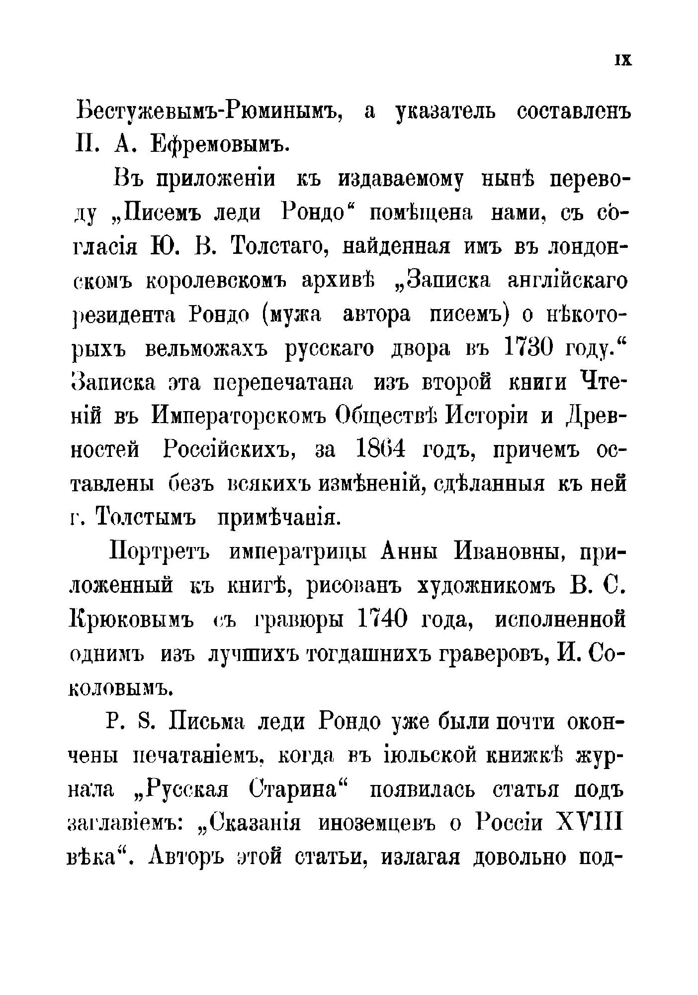 Содержание: Несколько слов об издании / С. Ш. Предисловие / Сочинение К.Н. Бестужева-Рюмина. Письма леди Рондо. Примечания к ним. Записка английского резидента Рондо: Характеры некоторых русских вельмож. Примечания к ней Ю.В. Толстого. Алфавитный указатель