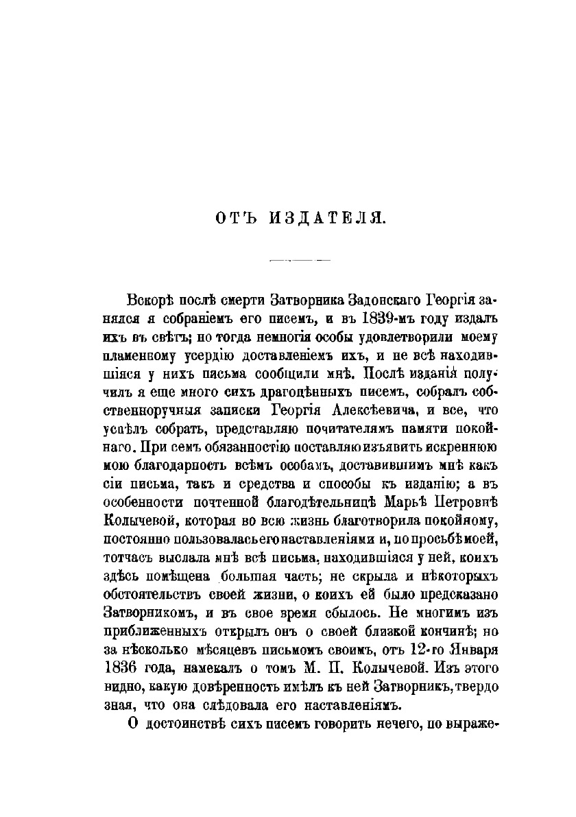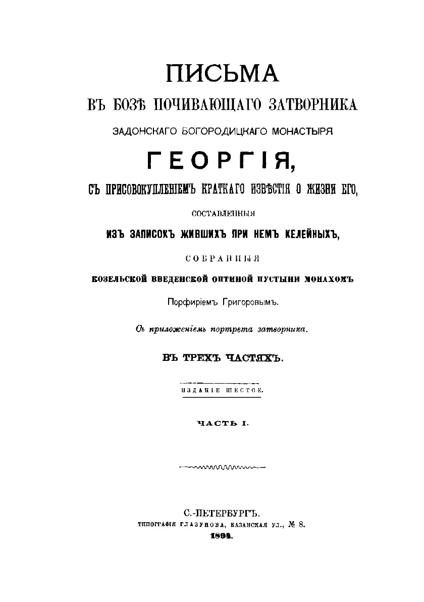 Письма в Бозе почивающего затворника Задонского Богородицкого Монастыря Георгия, с присовокуплением краткого известия о жизни его, составленние из записок живших при нем келейных, собранные Козельской Введенской Оптиной Пустыни монахом Порфирием Григоровым. С приложением портрета и почерка руки затворника. В 3-х частях. Издание 6.