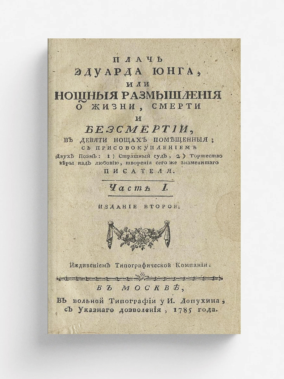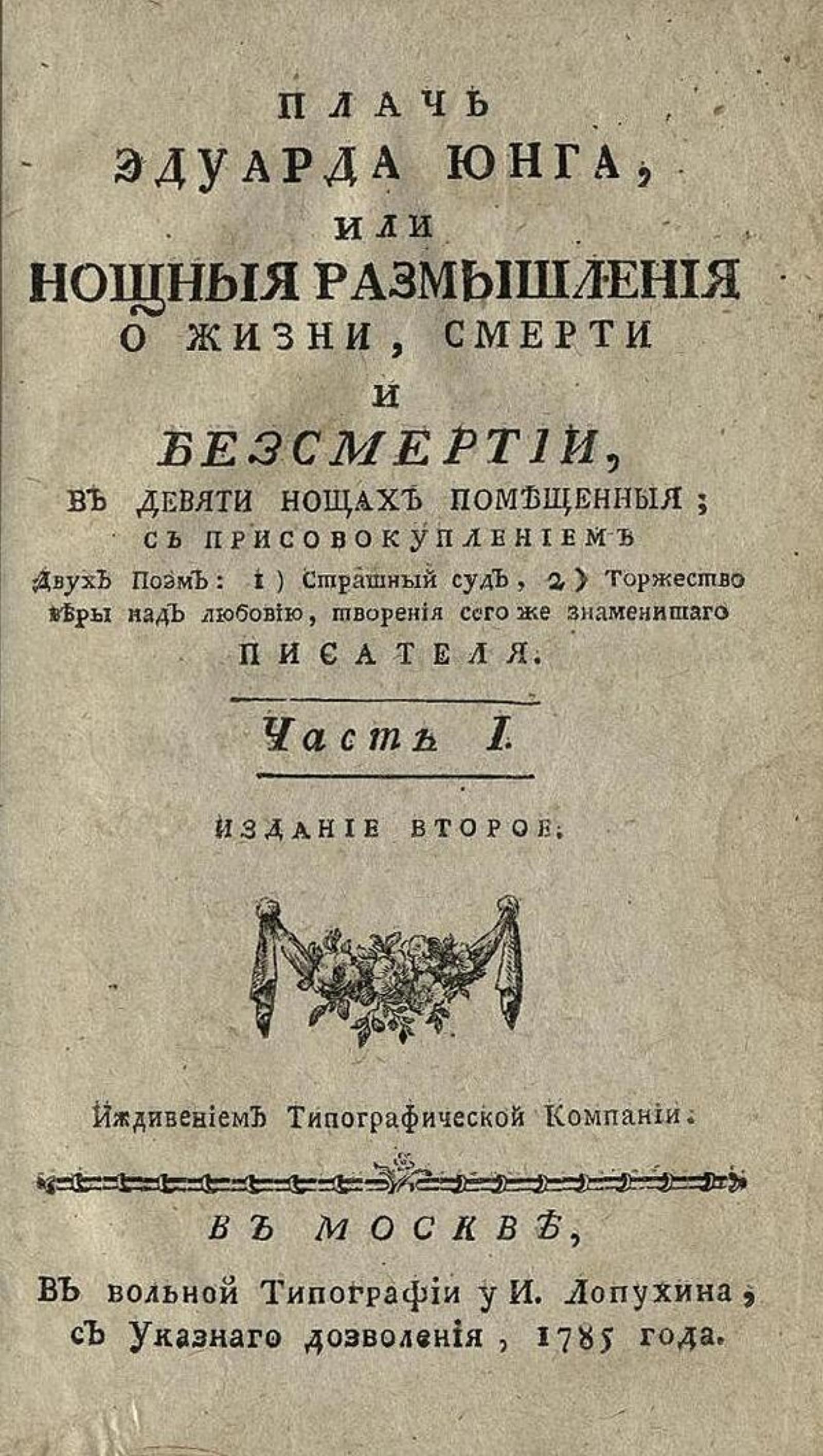 Юнг, Эдуард (1683–1765). Плачь Эдуарда Юнга, или Нощныя размышления о жизни, смерти и безсмертии, : В девяти нощах помещенныя; : С присовокуплением двух поэм: 1) Страшный суд, 2) Торжество веры над любовию, творения сего же знаменитаго писателя. / [Пер. с нем. яз. А. М. Кутузов] ; Иждивением Типографической компании. — издание второе. — В Москве : В вольной типографии у И. Лопухина, 1785. Ч. 1. — В Москве : В вольной типографии И. Лопухина, 1785. — [6], 1-329, 340-410 [=400] с.; см.