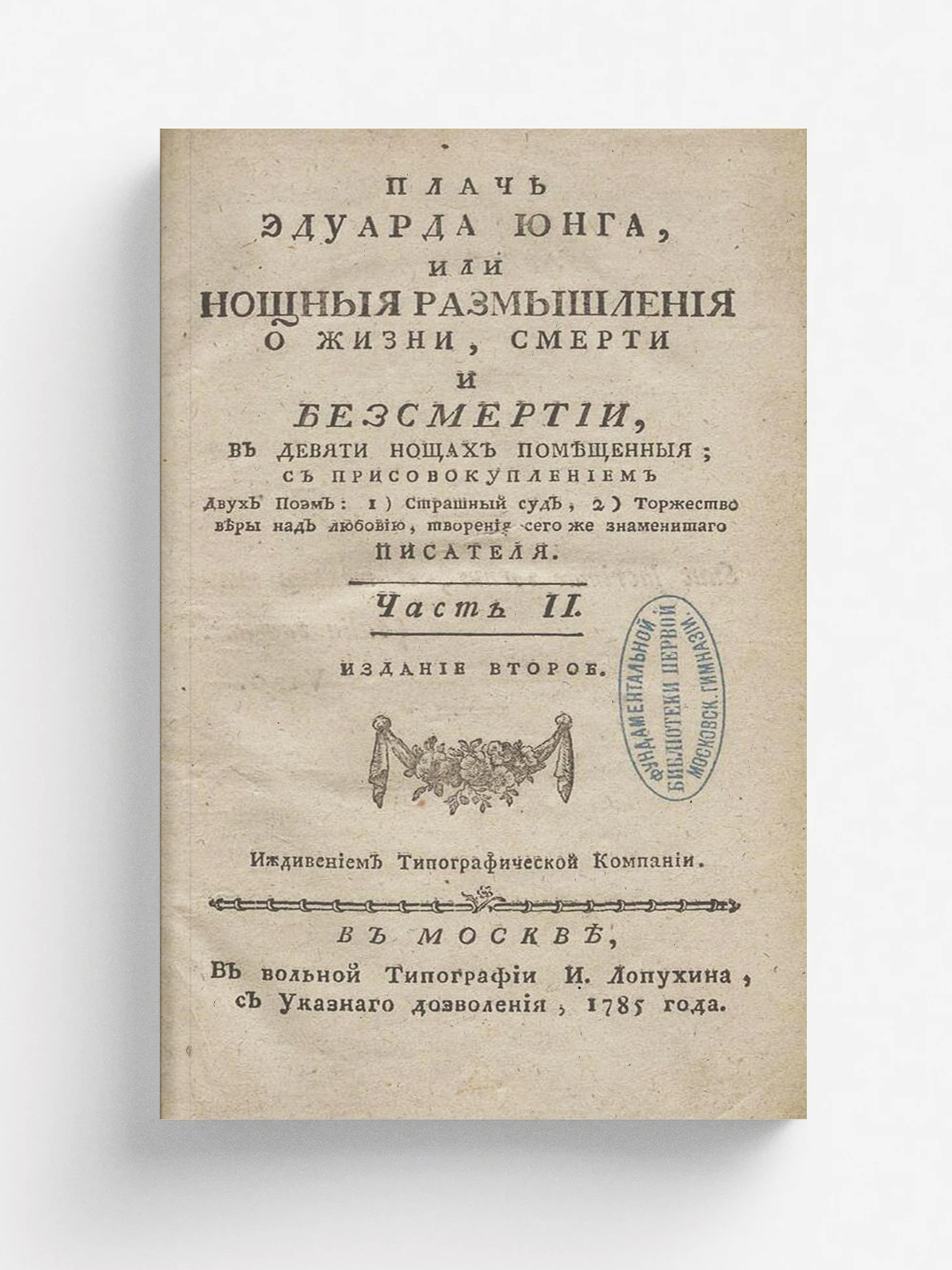 Юнг, Эдуард (1683–1765). Плачь Эдуарда Юнга, или Нощныя размышления о жизни, смерти и безсмертии, : В девяти нощах помещенныя; : С присовокуплением двух поэм: 1) Страшный суд, 2) Торжество веры над любовию, творения сего же знаменитаго писателя. / [Пер. с нем. яз. А.М. Кутузов] ; Иждивением Типографической компании. — издание второе. — В Москве : В вольной типографии у И. Лопухина, 1785. Ч. 2. — В Москве : В вольной типографии И. Лопухина, 1785. — [4], 556 с.; см.
