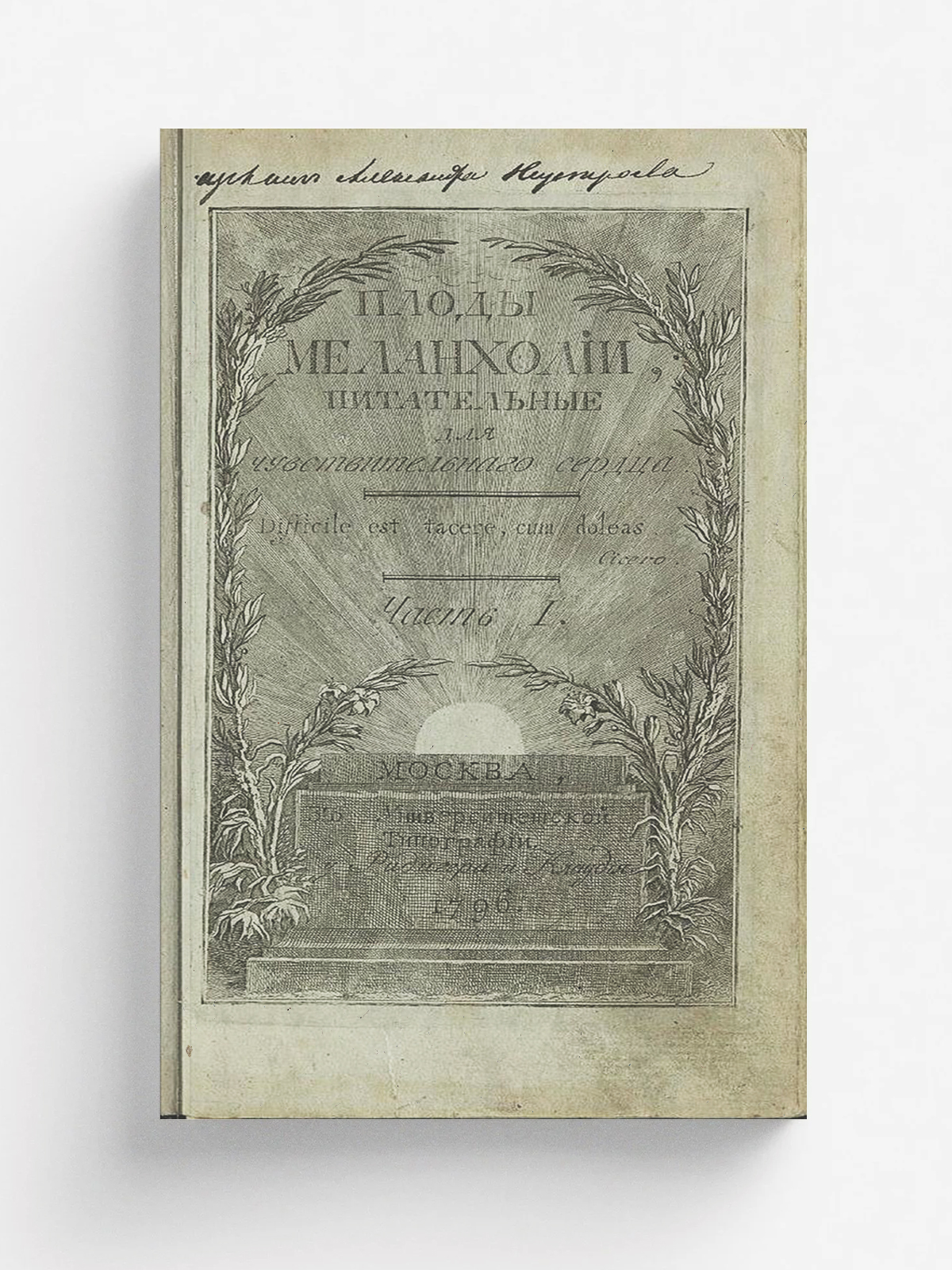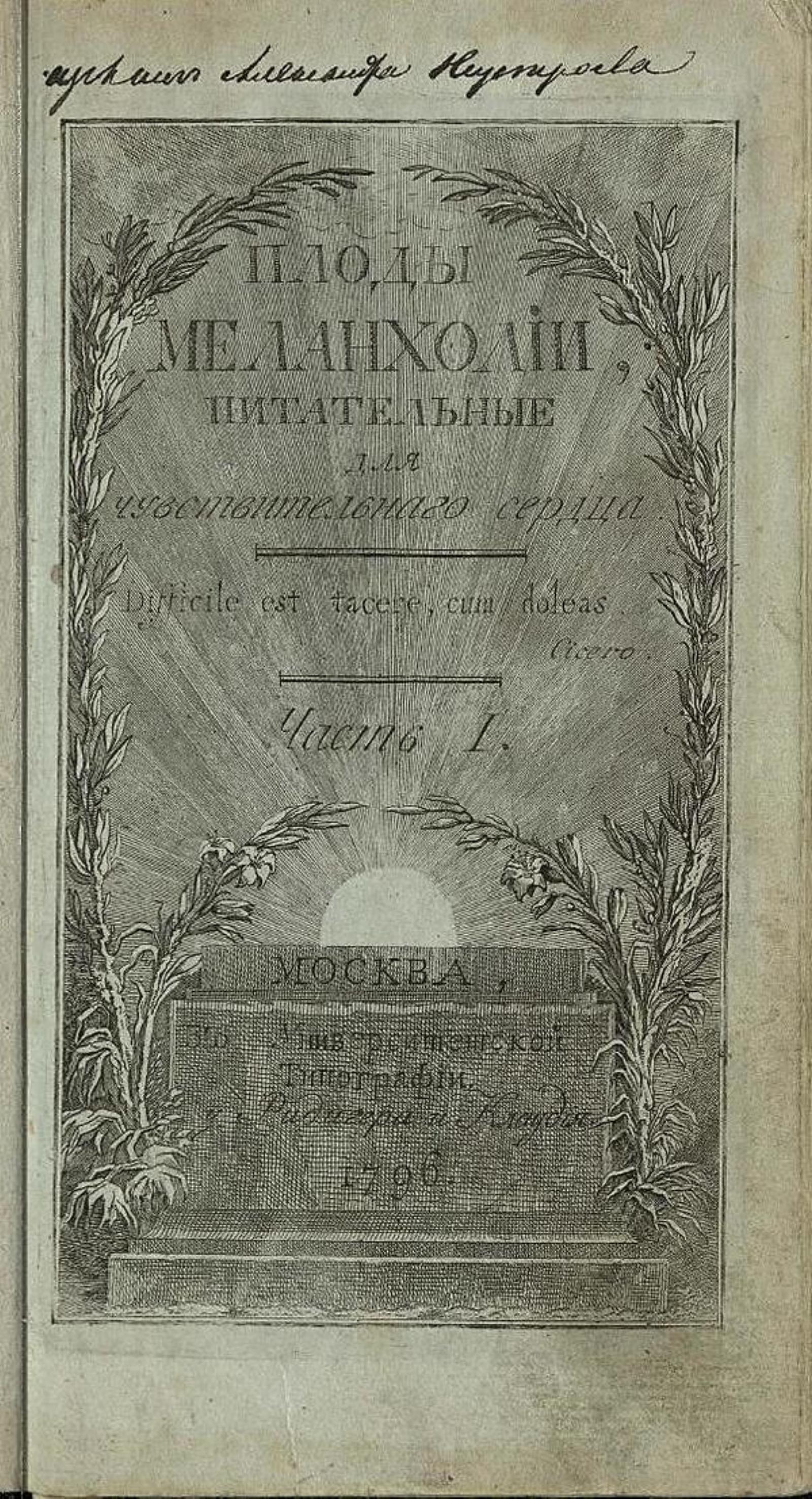 Победоносцев, Петр Васильевич (1771–1843). Плоды меланхолии, питательныя для чувствительнаго сердца. — Москва : Унив. тип., у Ридигера и Клаудия, 1796. — 8°. Ч.1 [Текст]. — [5], 108 с., [1] л. фронт.