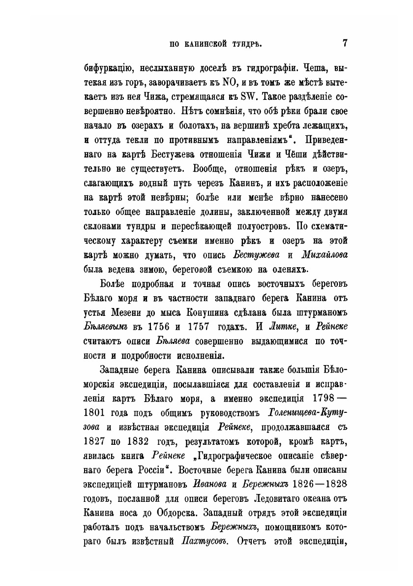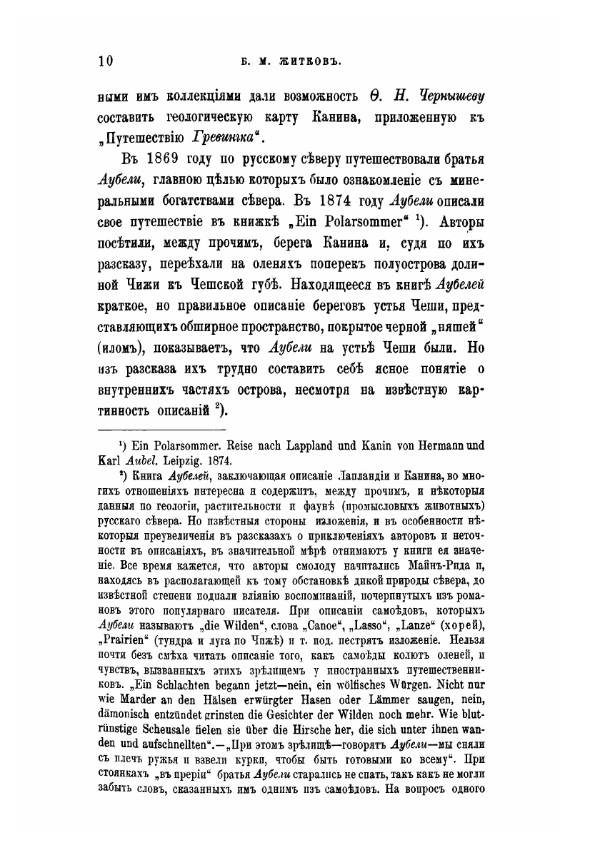Состоявшаяся в июне – августе 1902 года экспедиция Русского географического общества на Канин полуостров нашла свое отражение в труде Б.М. Житова «По Канинской тундре». В работе рассказывается о плавании на пароходе от Архангельска до Мезени и на карбасе до устья реки Чижи, об особенностях рек и озер, флоре и фауне полуострова. Ненецкие (самоедские) становища, занятия местного населения, гидрографические, географические, зоологические исследования в долинах рек Чижи и Чеши – отчет обо всем этом в работе зоолога, биогеографа, охотоведа, знатока Севера. Книга содержит топографическую съемку, метеорологические наблюдения, иллюстрации и карты