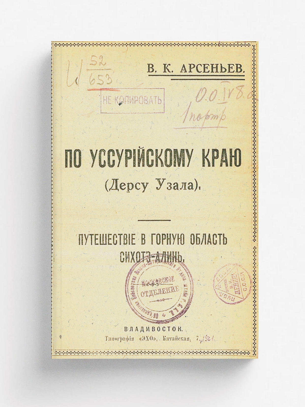 Арсеньев, Владимир Клавдиевич (1872–1930). По Уссурийскому краю (Дерсу Узала): Путешествие в горную область Сихотэ-Алинь / В. К. Арсеньев. — Владивосток: Тип. «Эхо», [1921]. — V, 280, XVI с., [1] л. портр.; 21 см.