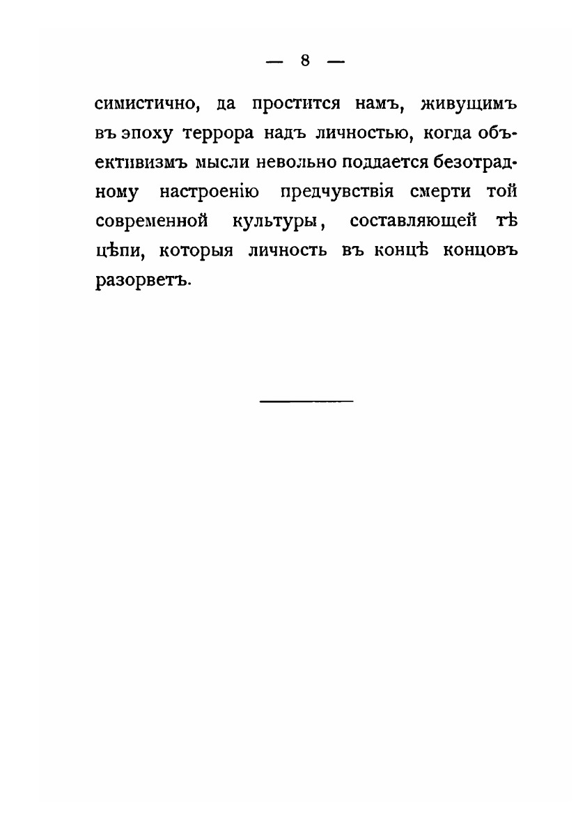 Выпуская в свет настоящий очерк, считаем долгом оговориться, что мы не претендуем на научную скурпулезность, которая боится Смелых выводов. Когда дело идет о посильном предвидении будущего социального строя, можно и должно дать место и чутью и, если хотите, полету фантазии. Мы, замечая уже судороги родов грядущего анархизма, лишний раз позволяем себе повторить: caveant consules! тем, которые обладая индивидуальной и коллективной властью, забывают личность с ее запросами свободы. Может быть наше настроение слишком пессимистично, да простится нам, живущим в эпоху террора над личностью, когда объективизм мысли невольно поддается безотрадному настроенно предчувствия смерти той современной культуры, составляющей те цепи, которые личность в конце концов разорвет.