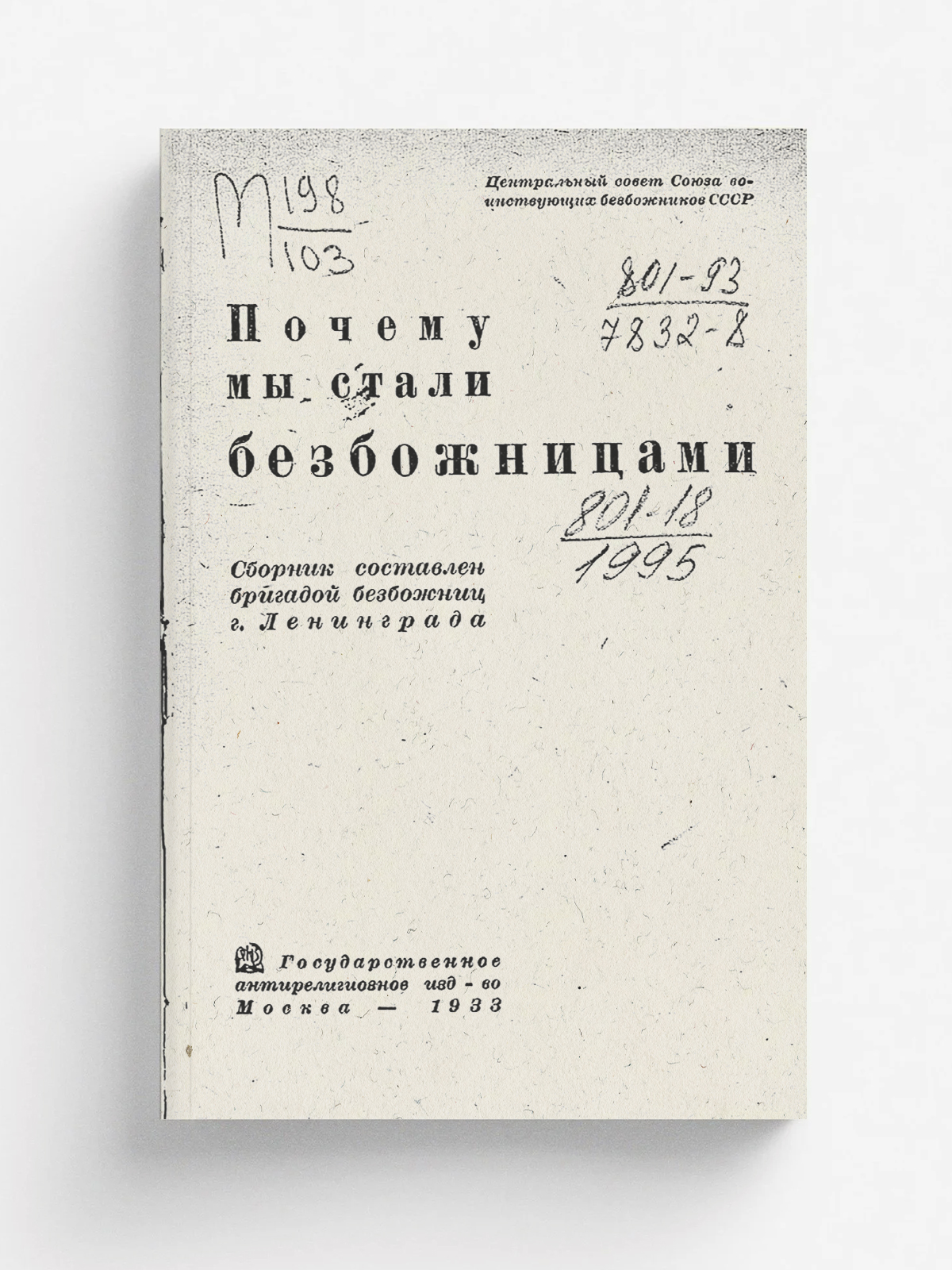 Почему мы стали безбожницами. Сборник сост. бригадой безбожниц г. Ленинграда / Центр. совет Союза воинств. безбожников СССР. — Москва : Гаиз., 1933 («Образцовая» тип.). — Обл., 51 с., 1 с. объявл. : портр.; 20?13 см.