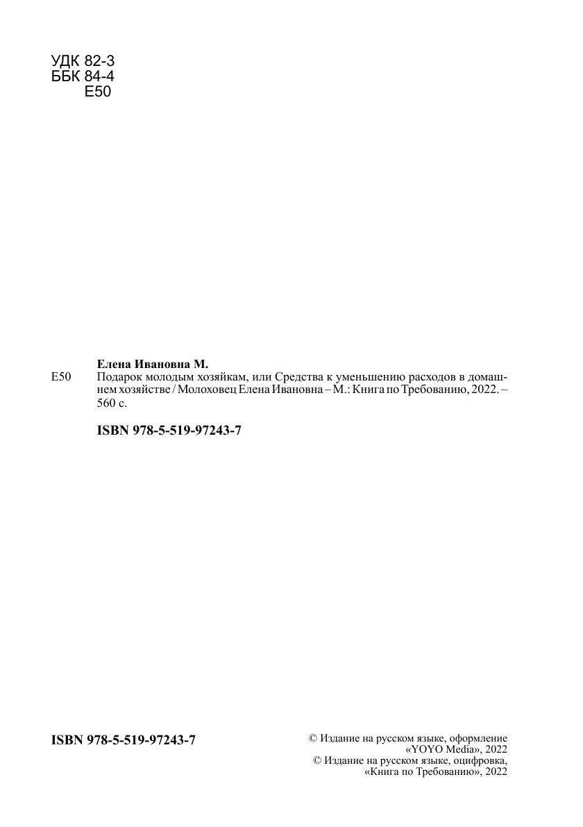 Печатная книга «Подарок молодым хозяйкам, или Средства к уменьшению расходов в домашнем хозяйстве» в мягкой обложке, язык - русский. В книге 560 страниц, она напечатана на белой офсетной бумаге плотностью 80 г/м². Формат издания — 148x210 мм. Все книги аккуратно упаковываем в прочный трёхслойный непрозрачный картонный конверт.