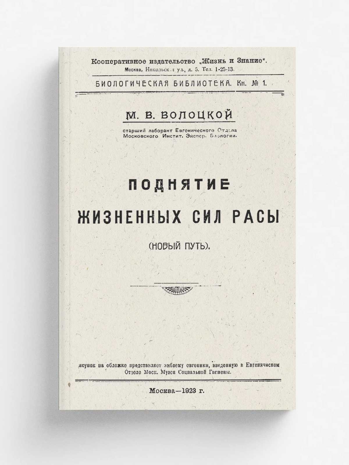 Волоцкой, Михаил Васильевич. Поднятие жизненных сил расы [Текст] = Die Hebung der Lebenskraft der Rasse : (новый путь) / М. В. Волоцкой старший лаборант евгенического отдела Московского институт[а] экспер. биологии. — Москва : Жизнь и знание, 1923. — 96 с. : ил., табл.; 22 см. — (Биологическая библиотека; Кн. № 1).