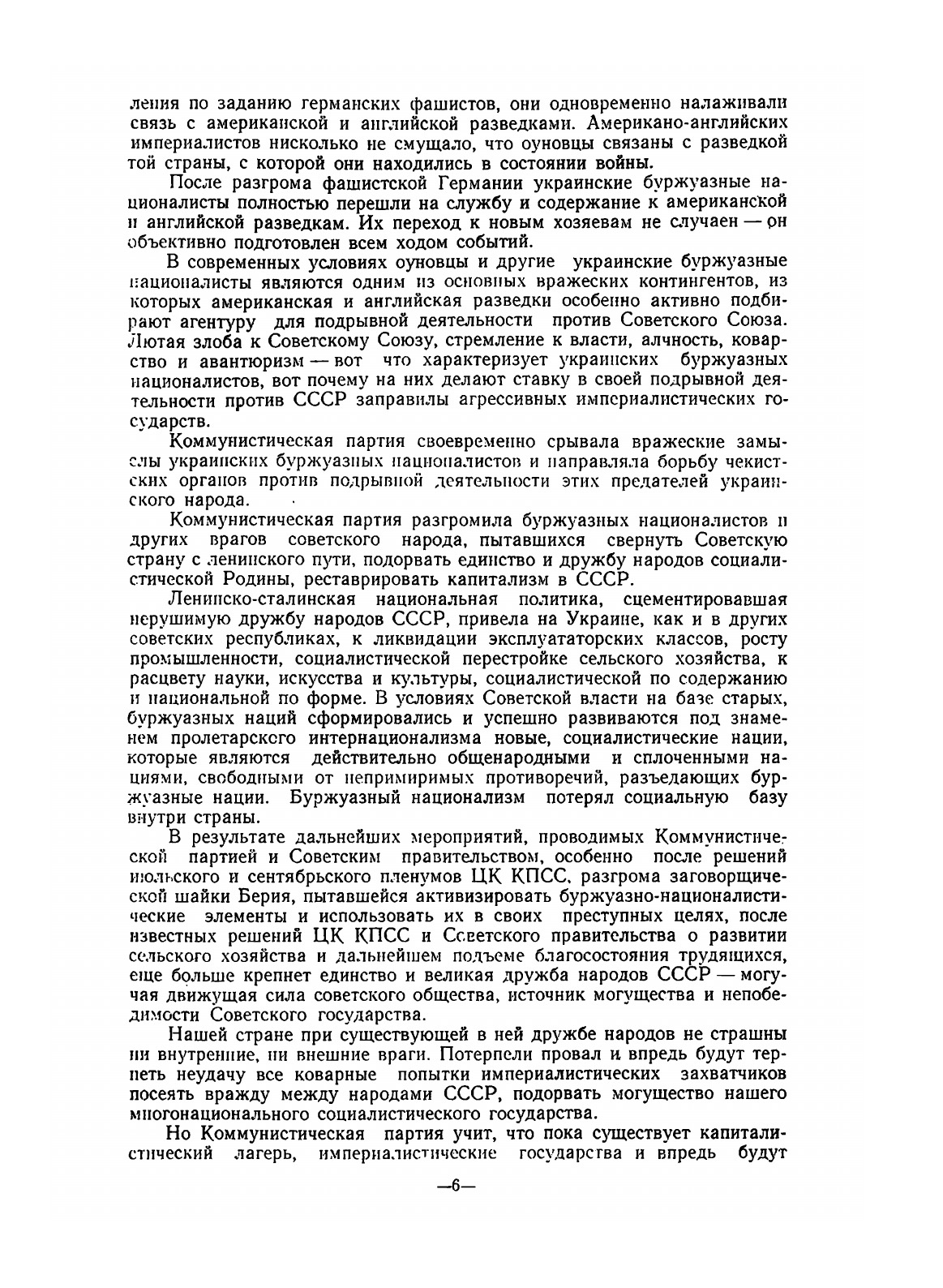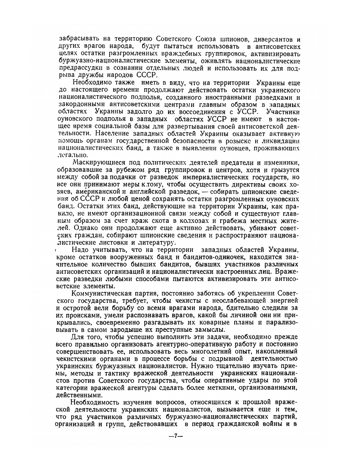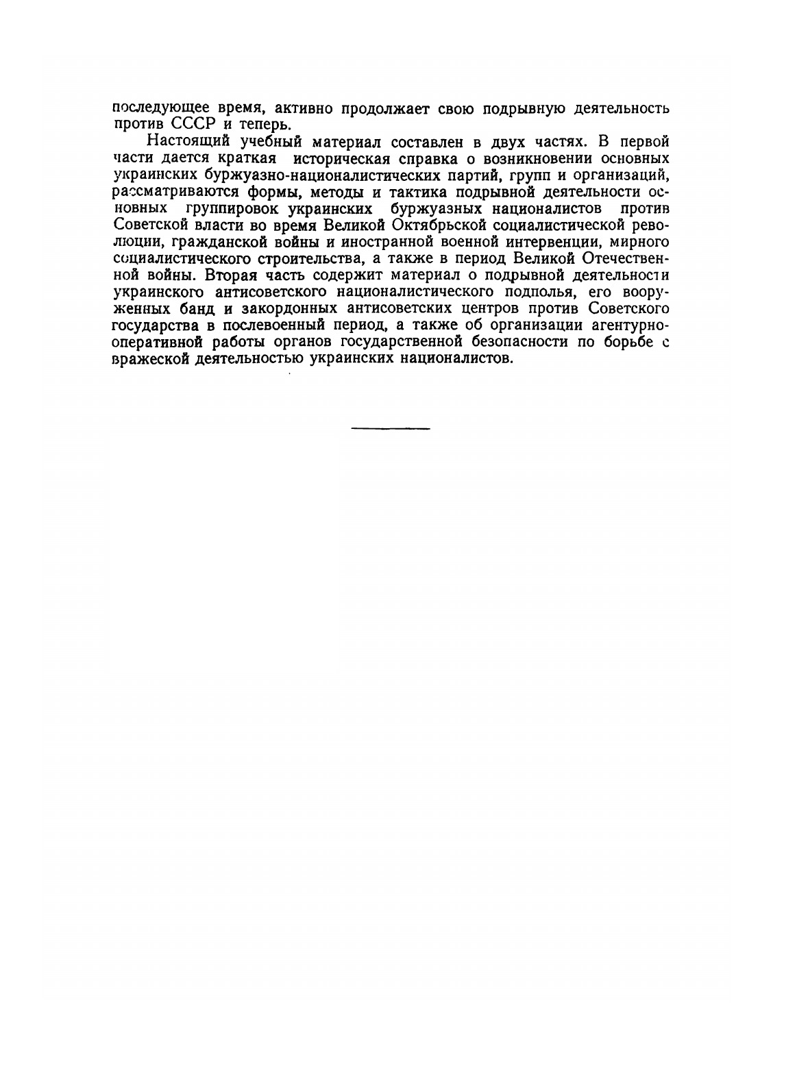 Предлагаемый учебный материал содержит сведения о подрывной деятельности украинских буржуазных националистов против СССР и основных агентурно-оперативных мероприятиях по борьбе с нею органов государственной безопасности. Этот учебный материал, обобщающий некоторый практический опыт по борьбе с подрывной деятельностью украинских националистов, является ориентирующим и не претендует на исчерпывающую полноту изложения вопроса, ибо в чекистской практике могут быть более удачные приемы агентурно-оперативной работы. Главное внимание в учебном материале уделено вопросам организации агентурно-оперативной работы по борьбе с подрывной деятельностью украинских националистов па территории Украины, особенно в её западных районах, так как эго является наиболее важной задачей по ликвидации остатков украинского антисоветского националистического подполья. В учебном материале даются лишь краткие сведения о возникновении и развитии украинского буржуазного национализма, показывающие его сущность и классовые корни. Для сотрудников органов государственной безопасности, которым по роду работы необходимо изучить этот вопрос более основательно, в конце учебного материала прилагается список литературы. Высшая школа просит сотрудников органов КГБ, ознакомившихся с данным учебным материалом, направлять в её адрес свои критические замечания о пособии и предложения по улучшению его в последующих изданиях. Пользоваться учебным материалом, как совершенно секретным, надлежит лишь в учебных и служебных помещениях школ и органов Комитета государственной безопасности. Размножать учебный материал не разрешается. Допущен Управлением учебных заведений Комитета государственной безопасности при Совете Министров СССР для использования в оперативно-чекистских школах и органах