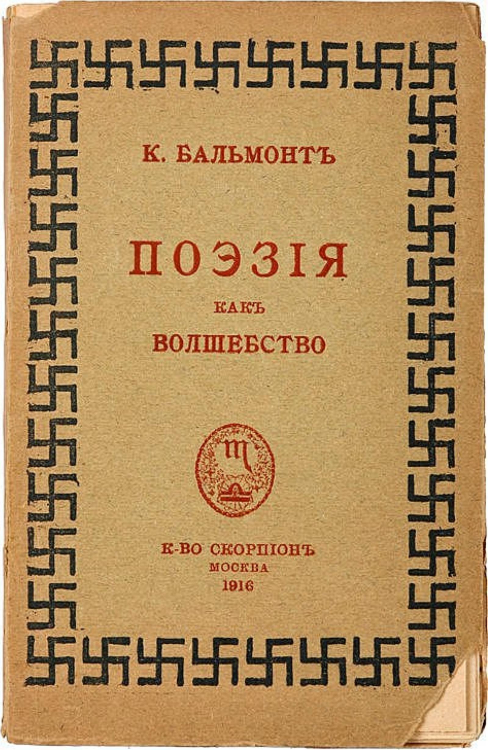 Бальмонт, Константин Дмитриевич (1867–1942). Поэзия как волшебство / К. Бальмонт. — Москва : Скорпион, 1915. — 93 с.; 18. На обороте тит. л. дата: 1914-1915; на обл. дата: 1916