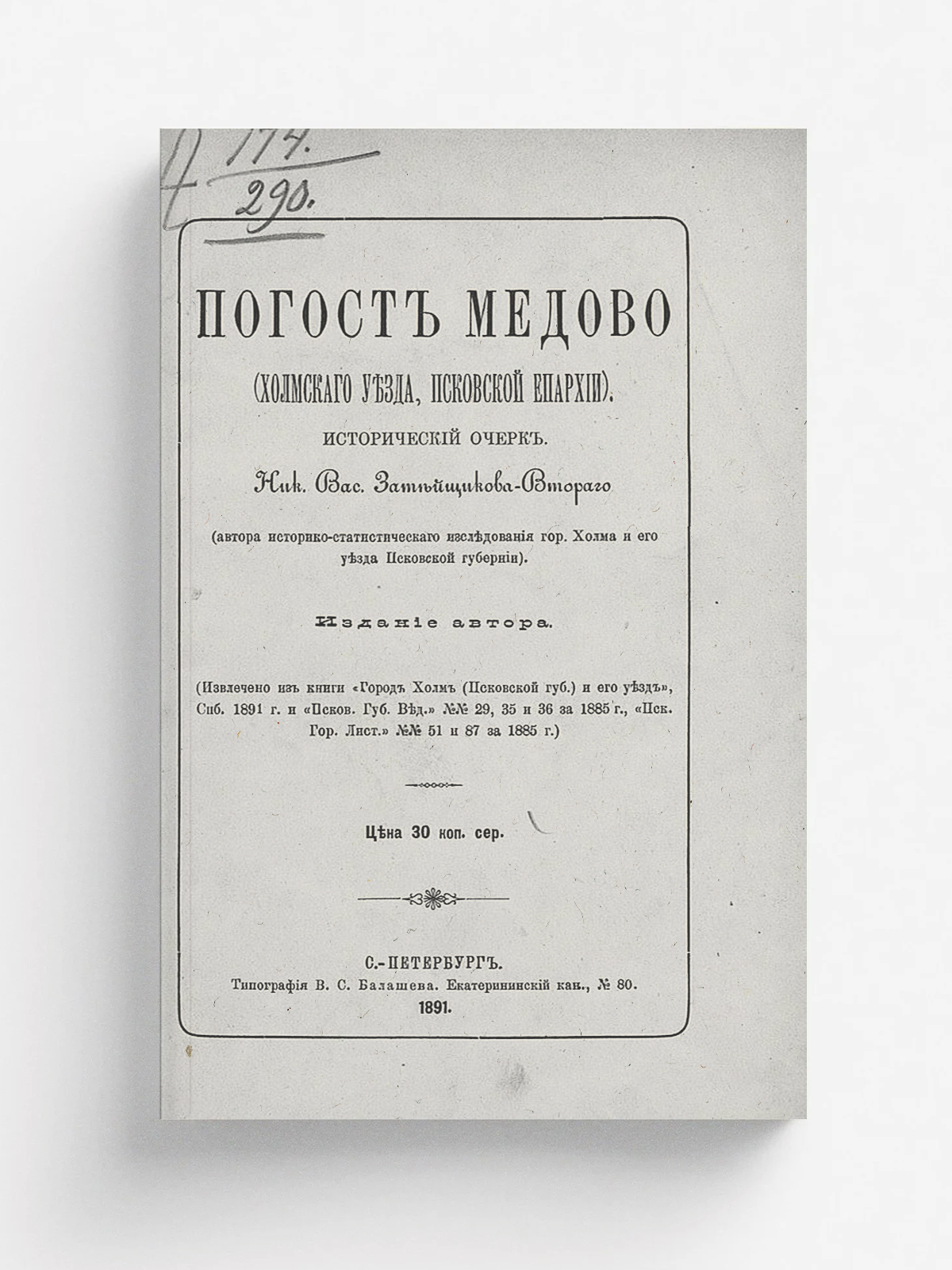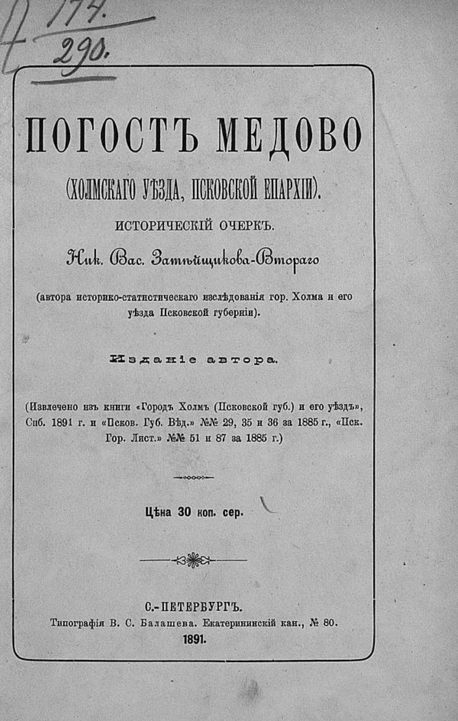 Затейщиков, Николай Васильевич. Погост Медово (Холмского уезда, Псковской епархии) : Ист. очерк / [Соч.] Ник. Вас. Затейщикова-Второго (авт. ист.-стат. исслед. г. Холма и его уезда Пск. губ.). — Санкт-Петербург : изд. авт., 1891. — 28 с.; 22.