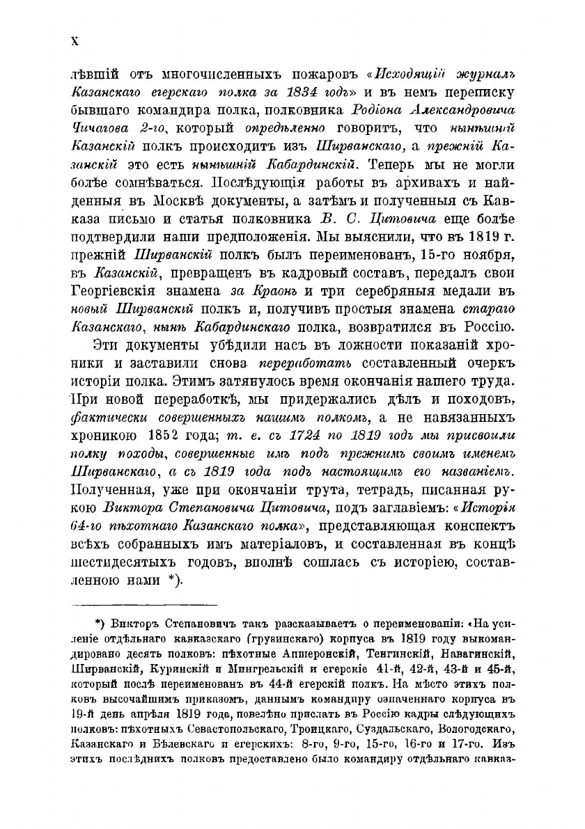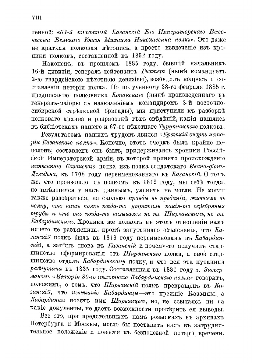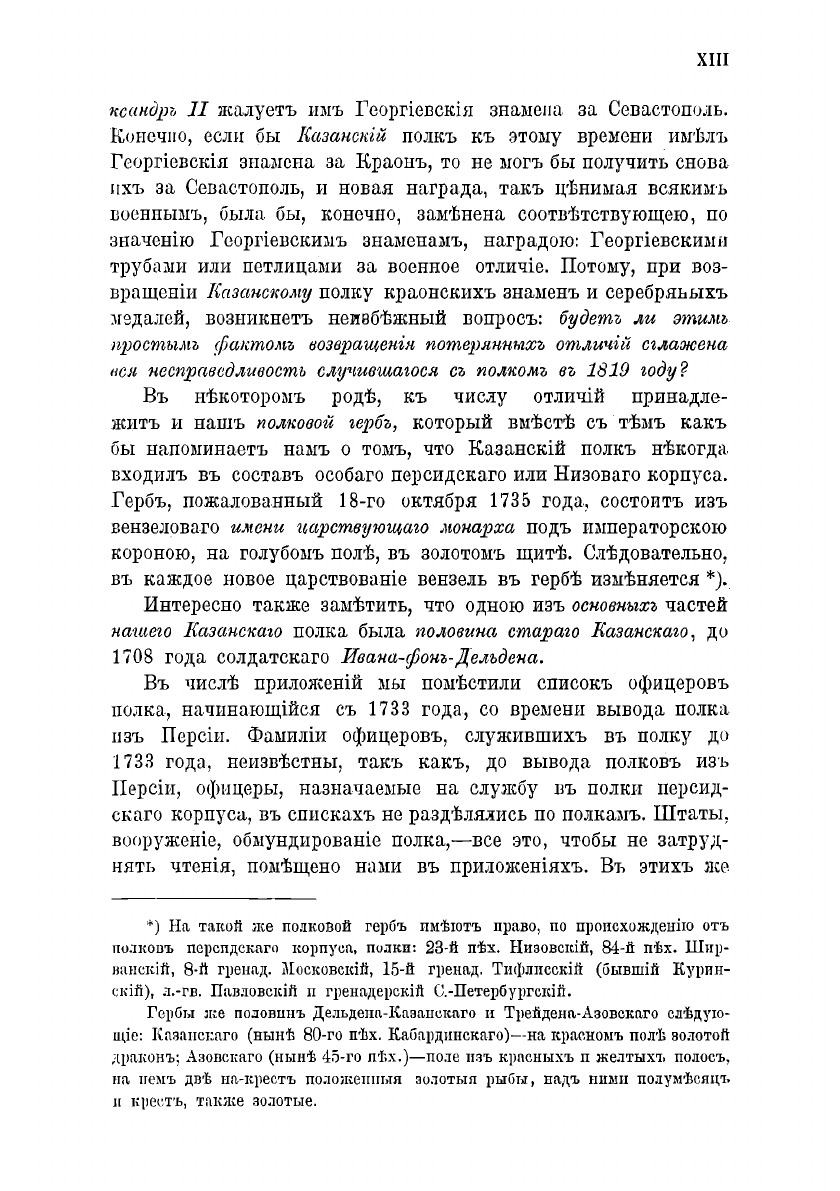Ныне, в торжественный день тезоименитства Вашего Императорского Высочества, в день Архистратига Михаила, в имени которого казанцы привыкли чтить уже второго Августейшего Шефа своего, - "старый персидский" полк заканчивает описание своей вековой жизни и имеет счастье повергнуть милостивому вниманию Вашего Императорского Высочества свою историю.