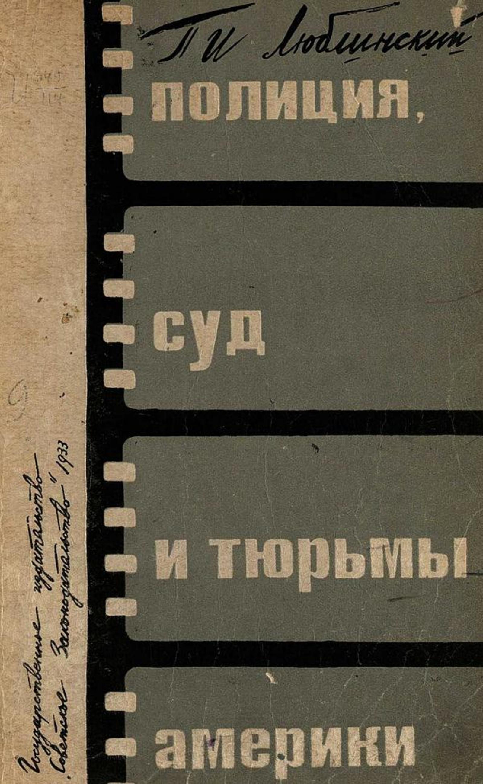Люблинский, Павел Исаевич (1882–1938). Полиция, суд и тюрьмы Америки / П. И. Люблинский ; [Предисл.: Г. И. Волков] ; [Гос. ин-т по изуч. преступности] ; Обл. и титул: Николай Сидельников. - [Москва] : [Сов. законодательство], [1933] (15 тип. «Полиграфкнига»). - 152 с., 4 вкл. л. крас. ил. : ил.; 23х15 см.