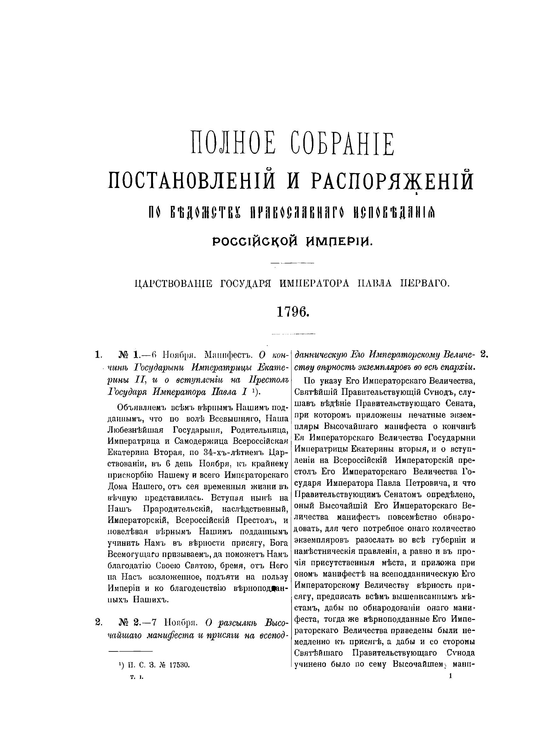 Царствование государя императора Павла Первого. 6 ноября 1796 г. – 11 марта 1801 г.