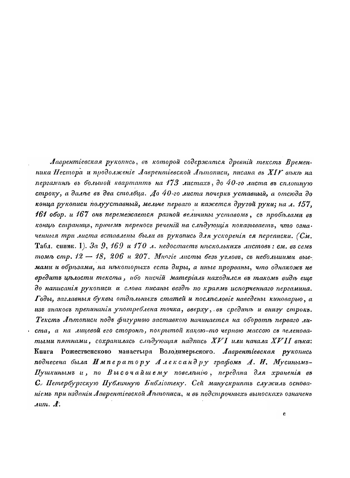 Первый том Полного собрания русских летописей, вышедший в 1846 г., уже давно исчез из научного обихода. Археографическая Комиссия два раза старалась заполнить этот пробел, выпуская вторым и третьим изданием Летопись по Лаврентьевскому списку под редакцией А. Ф. Бычкова и Повесть временных лет по Лаврентьевскому списку, точно воспроизводящую первую часть последнего издания. Комиссия в свое время (1872 г.) издала эту часть Лаврентьевской летописи и посредством светопечати. B настоящее время ни одного из перечисленных изданий не имеется в продаже, и лица, занимающиеся русской историей и древне-русским языком, могли пользоваться нашей древнейшей летописью только в больших научных библиотеках.