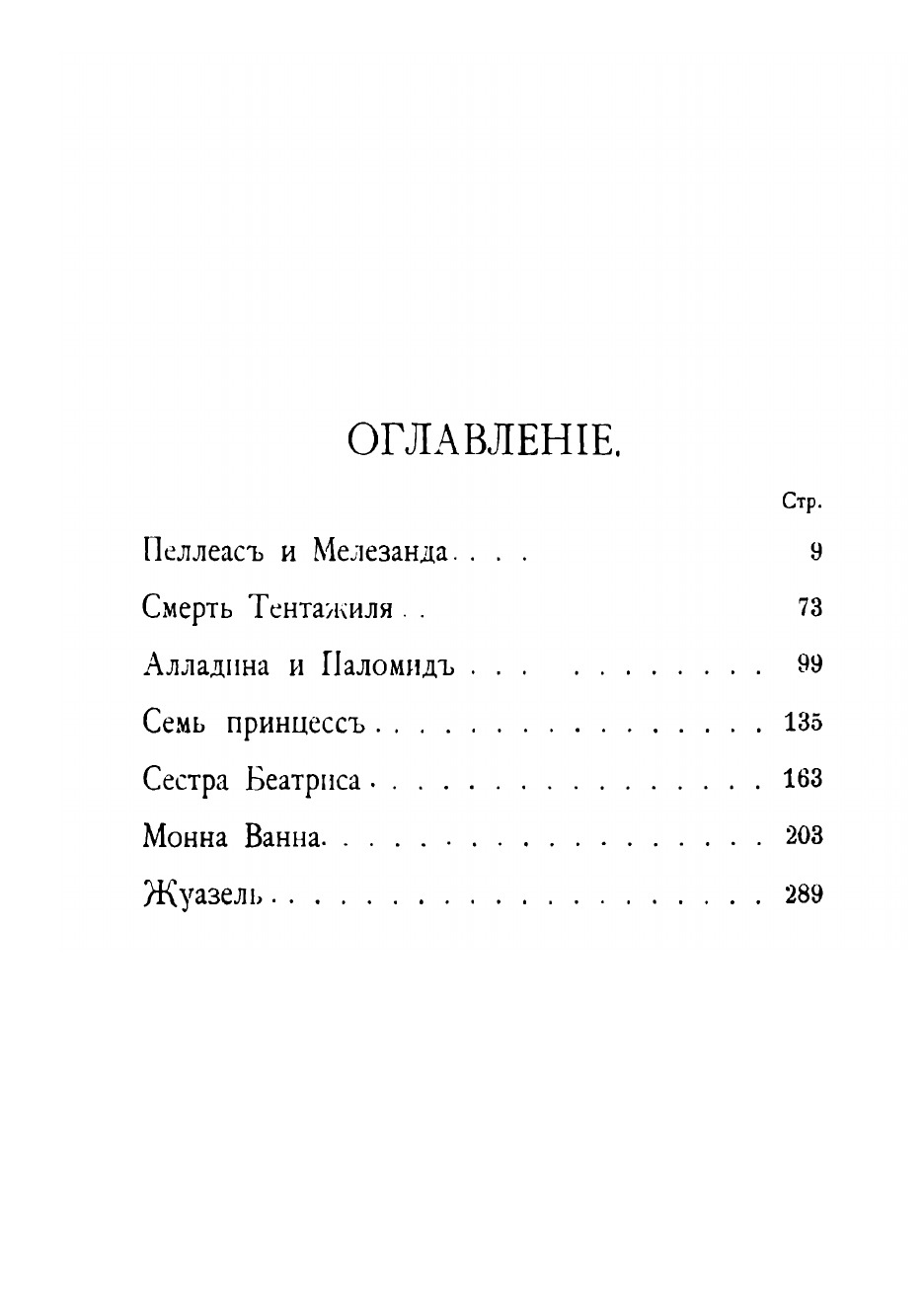 Содержание: Пеллеас и Мелезанда; Смерть Тентажиля; Алладина и Паломид; Семь принцесс; Сестра Беатриса; Монна Ванна; Жуазель