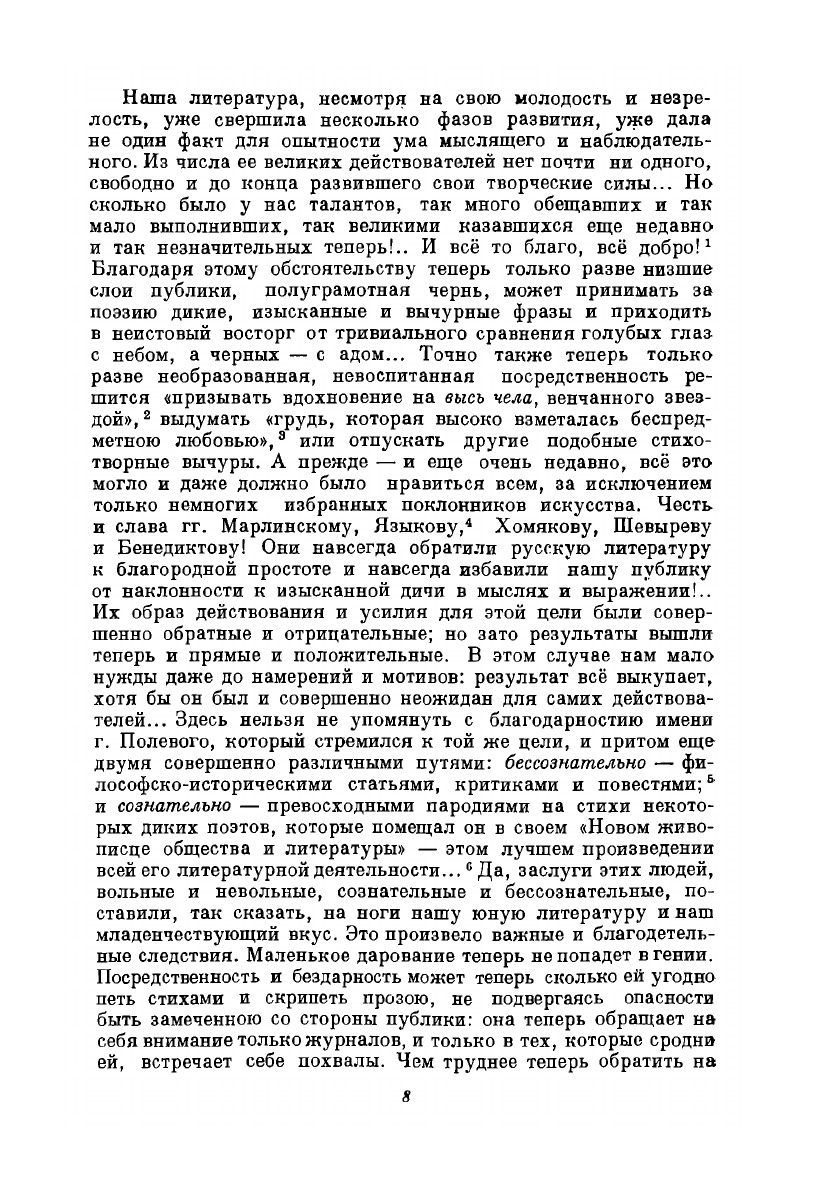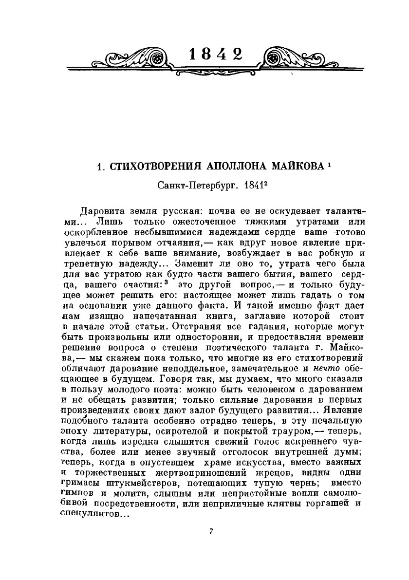 Статьи и рецензии 1842—1843 годов («Стихотворения Ап. Майкова», «Педант. Литературный тип», «Руководство к всеобщей истории. Сочинение Фридриха Лоренца», «Стихотворения А. Полежаева», «Похождения Чичикова, или Мертвые души», «Несколько слов о поэме Гоголя „Похождения Чичикова, или Мертвые души"», «Общеезначение слова литература», «Общий взгляд на народную поэзию», «Речь о критике», «Сочинения Державина», «Сочинения Гоголя», «Русская литература в 1842 году» и др.).