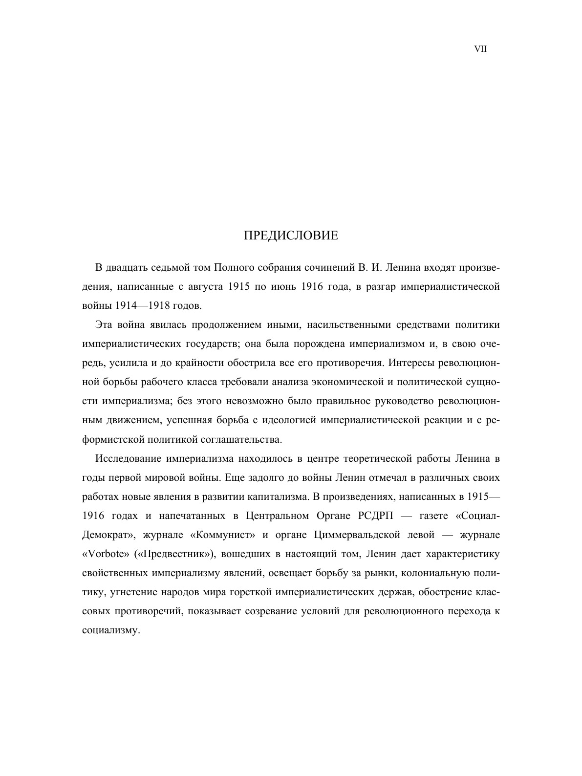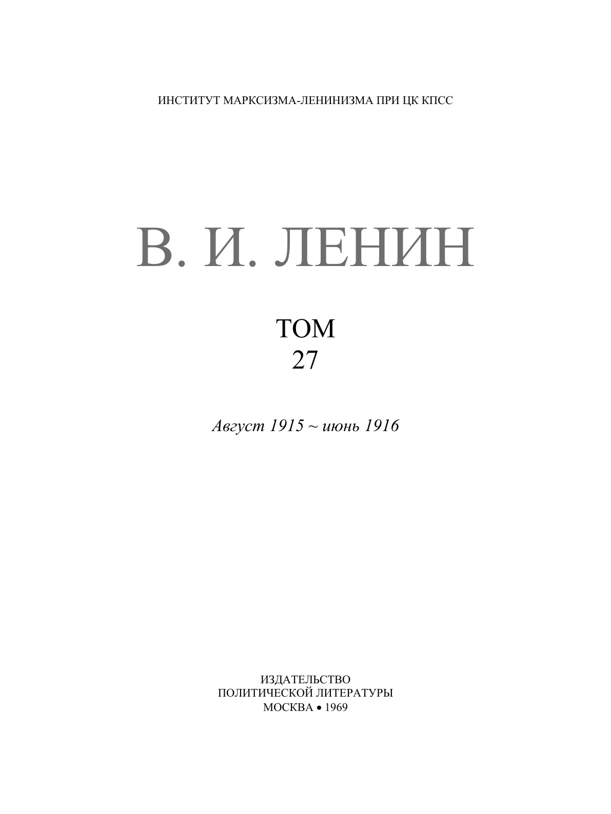 В двадцать седьмой том входят произведения, написанные с августа 1915 по июнь 1916 года, в разгар империалистической войны 1914—1918 годов.Эта война явилась продолжением иными, насильственными средствами политики империалистических государств; она была порождена империализмом и, в свою очередь, усилила и до крайности обострила все его противоречия. Интересы революционной борьбы рабочего класса требовали анализа экономической и политической сущности империализма; без этого невозможно было правильное руководство революционным движением, успешная борьба с идеологией империалистической реакции и с реформистской политикой соглашательства.