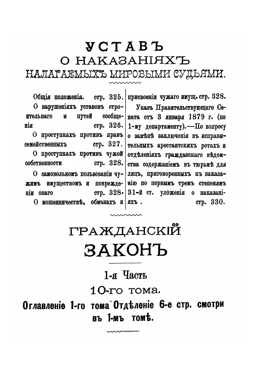 Собрание российских законов, уголовных и гражданских, всех 15-ти томов с указанием о том, в каком томе и в каком отделе, в случае надобности, всякому свое дело следует искать : Государственный закон Российской империи. Необходим всякому с указанием способ о том, как защищать самому себе без помощи адвоката или поверенного в уголовном и гражданском суде.Собрал частный поверенный Жемчужников, под редакцией юристов Лунина и Сергеева.
