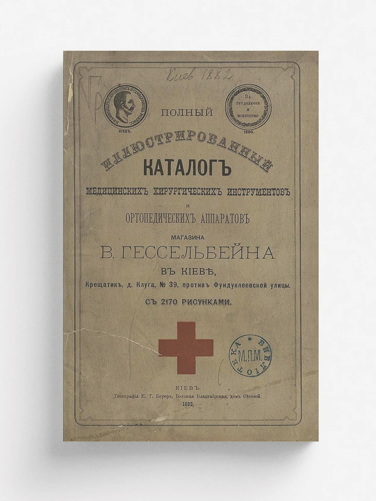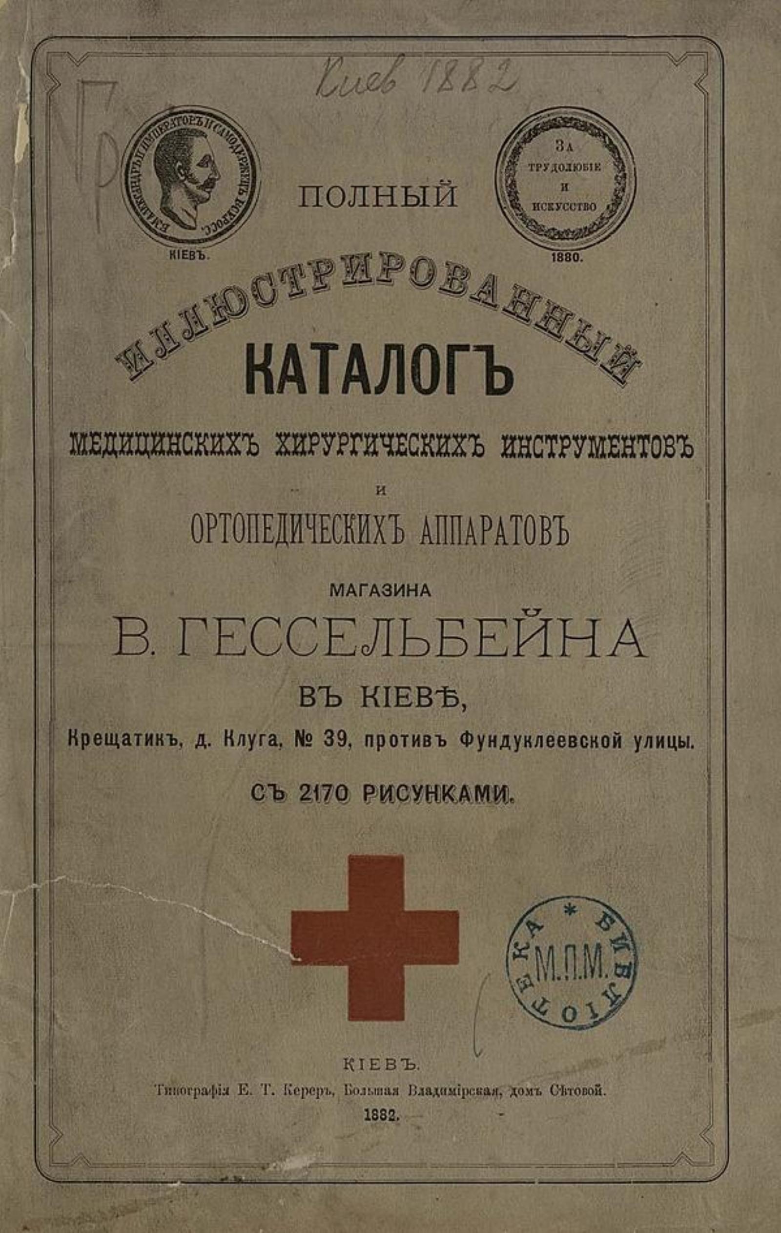 Гессельбейн, В., магазин (Киев). Полный иллюстрированный каталог медицинских хирургических инструментов и ортопедических аппаратов магазина В. Гессельбейна в Киеве : с 2170 рисунками. — Киев : Тип. Е. Т. Керер, 1882. — 211, 4 с. : ил.; 25 см.