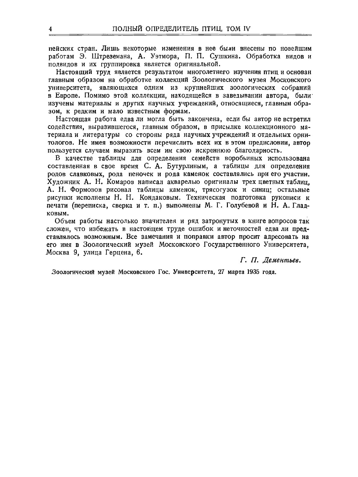 В настоящем четвертом томе "Полного определителя птиц", как и в трех предшествующих томах, географическое распространение птиц дается по живым урочищам (бассейны рек, хребты) и по установившимся географическим наименованиям. Содержанием четвертого тома настоящей работы является описание отряда воробьиных. Обилие форм этого отряда (число видов воробьиных превышает половину общего числа всех известных в настоящее время птиц) вынудило автора стремиться к максимальной сжатости изложения. В связи с этим биологические характеристики отдельных групп неизбежно стали очень краткими и главнейшие данные по биологии воробьиных пришлось сосредоточить в общей характеристике отряда.