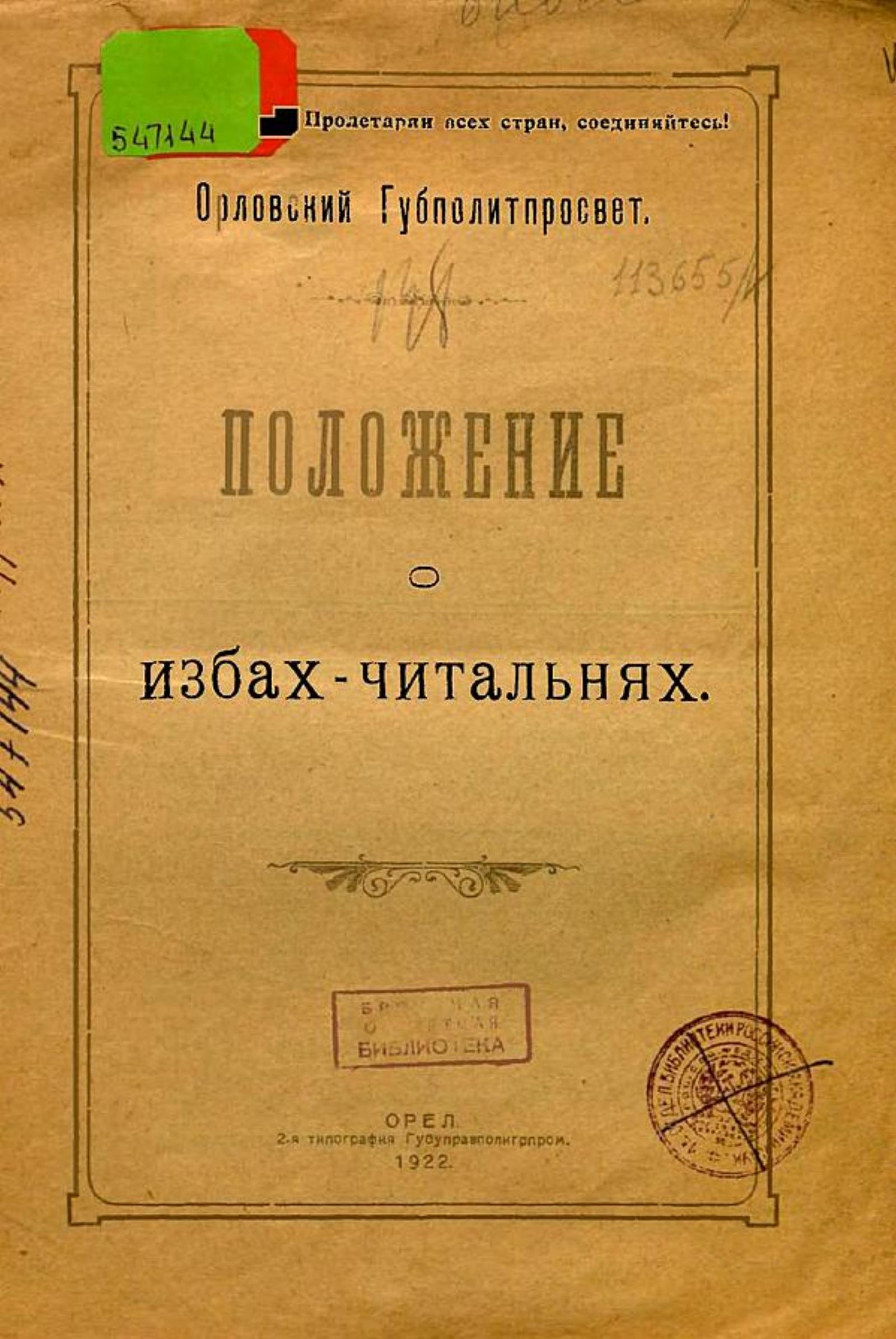 Положение о избах-читальнях [Текст] : Орловский Губполитпросвет. — Орел : [б. и.], 1922 (2-я типография Губуправполигрпром). — 16 с.