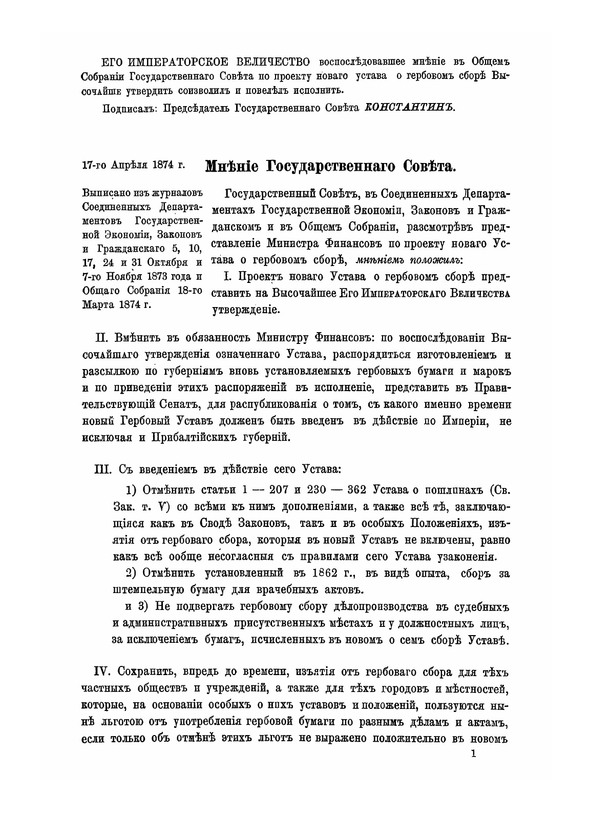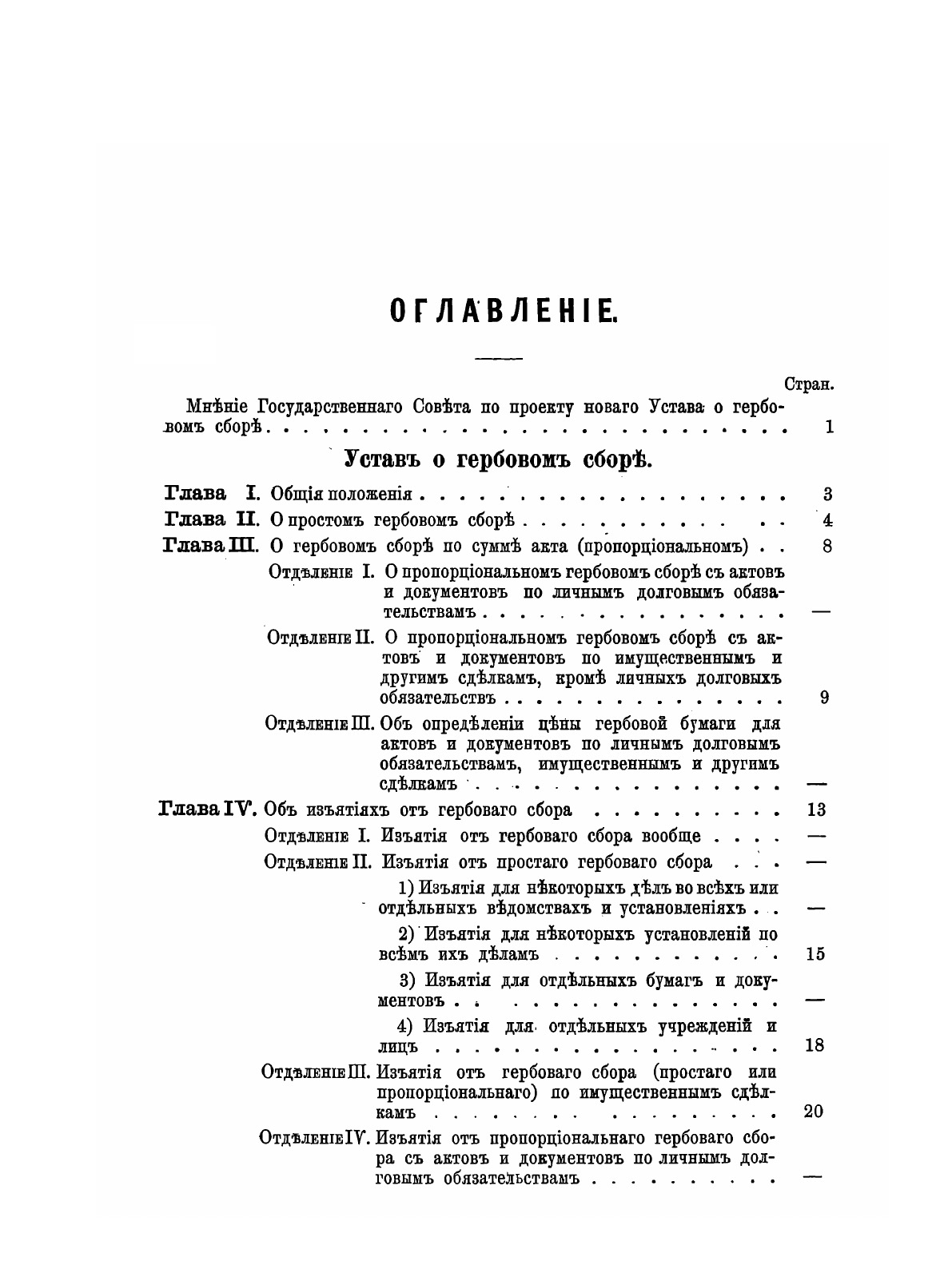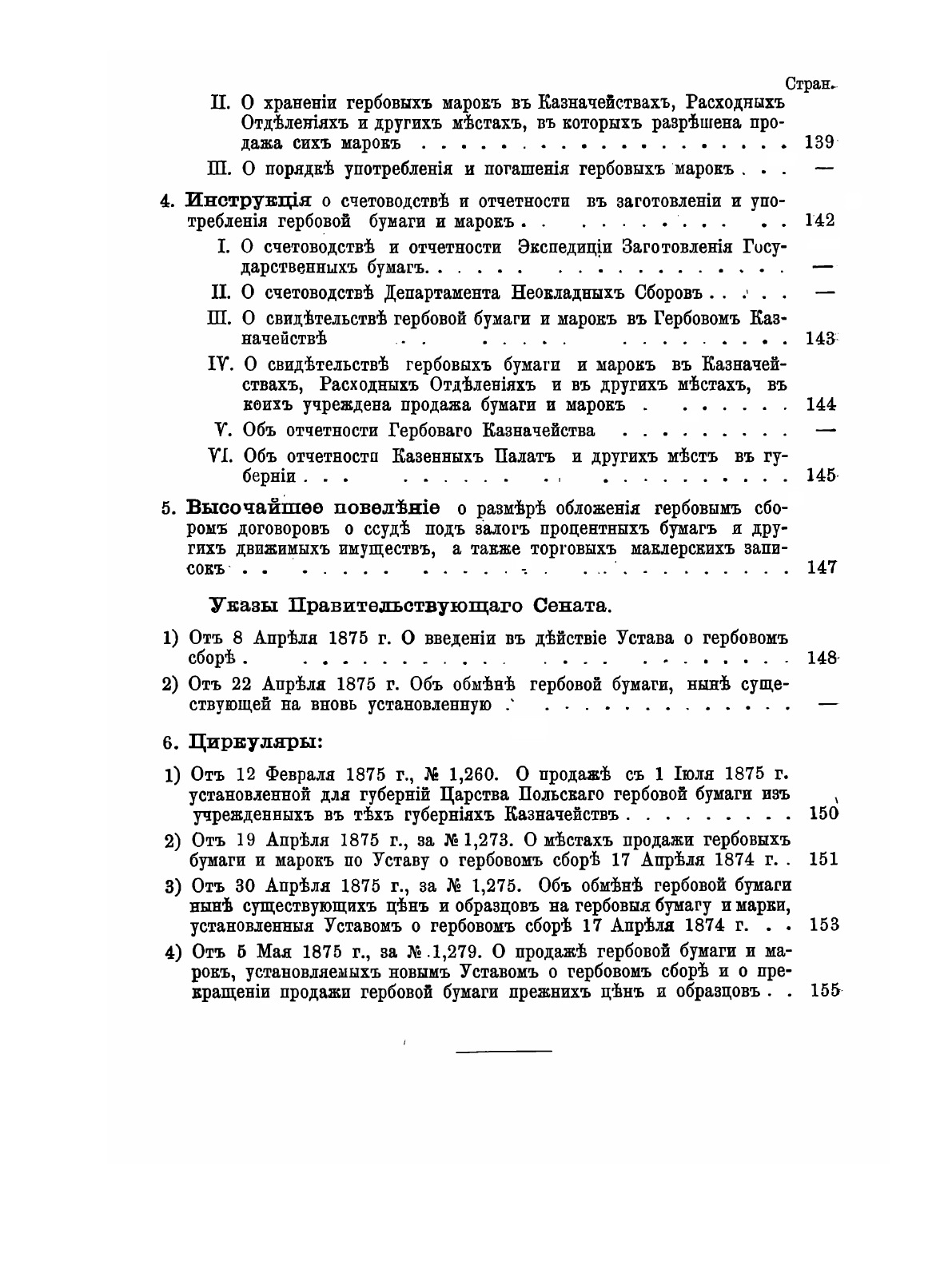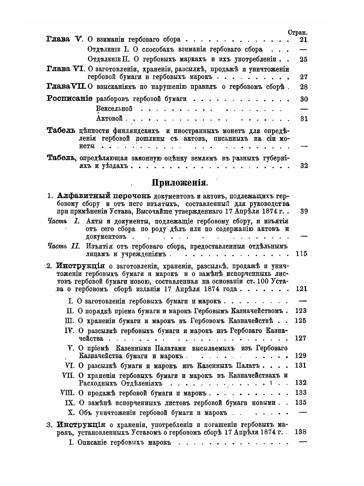 1. Устав 1874 г. 2. Алфавитный перечень бумаг, подлежащих платежу гербового сбора. 3. Инструкции. 4. Циркуляры и другие распоряжения, последовавшие по 25-е мая 1875 года.